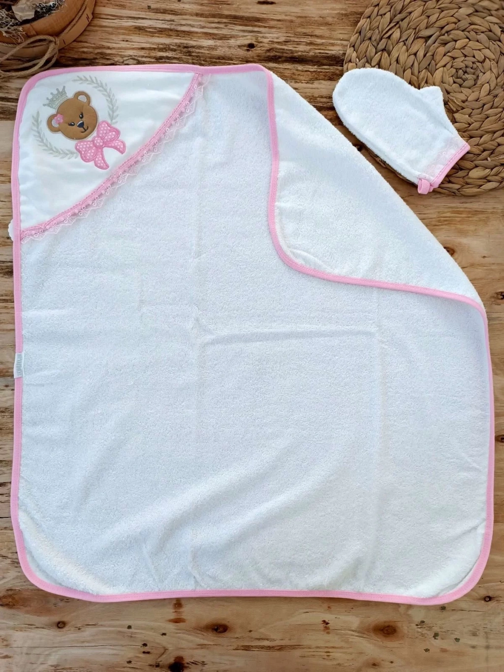 0-1 Yaş Bear Nakışlı El Keseli 2li Kız Bebek Havlu Takımı Pembe