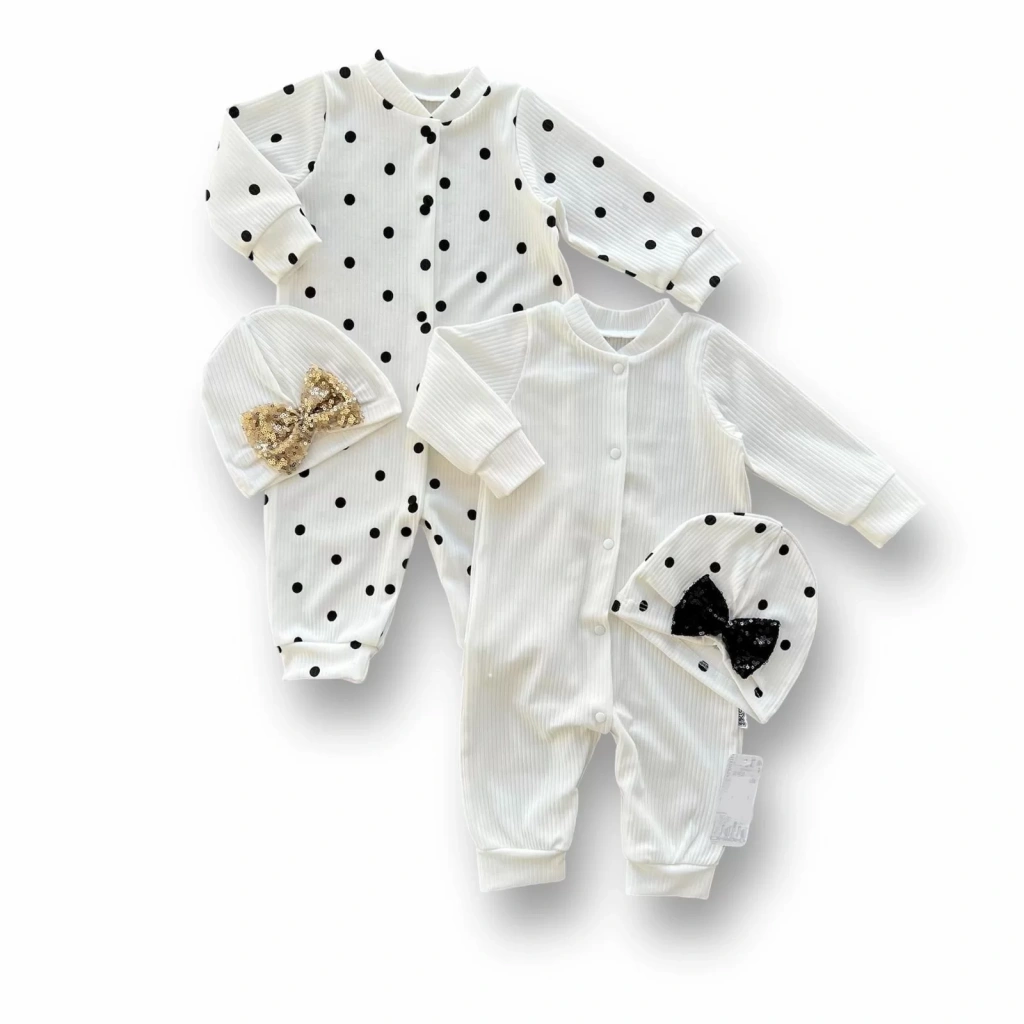 0-3 3-6 6-9 Ay Payetli Şapka Çıtçıt Kapamalı Puantiyeli Ve Düz 2 Li Kombin Kız Bebek Tulumları Beyaz