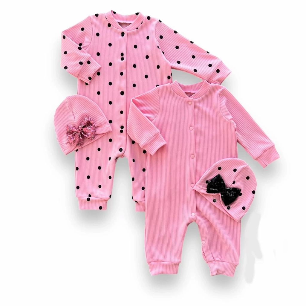 0-3 3-6 6-9 Ay Payetli Şapka Çıtçıt Kapamalı Puantiyeli Ve Düz 2 Li Kombin Kız Bebek Tulumları Pembe