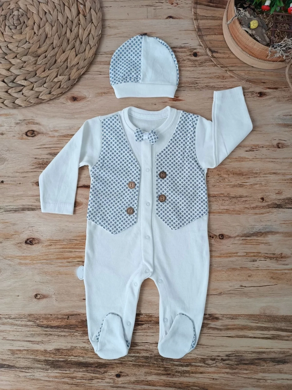 0-3 3-6 6-9 Ay Şapkalı Yelek Detaylı Boydan Çıtçıt Erkek Bebek Tulumu Ekru