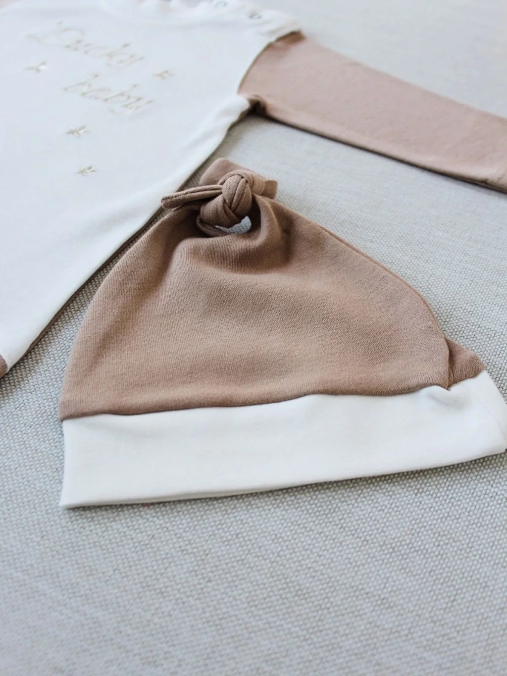 0-3 3-6 Ay Lucky Baby Nakışlı Es Çizgi Boy Şapkalı Erkek Bebek Tulumu Kahverengi