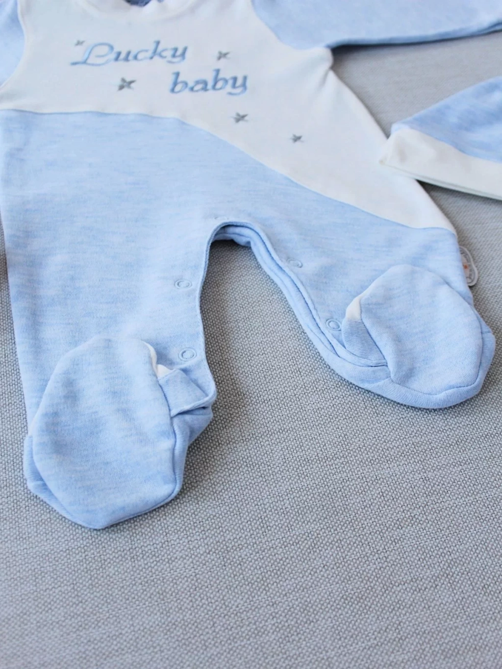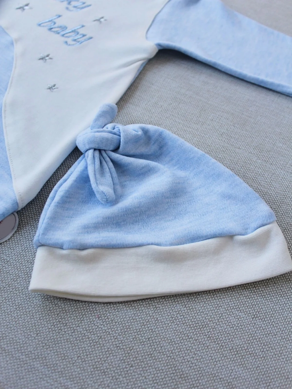 0-3 3-6 Ay Lucky Baby Nakışlı Es Çizgi Boy Şapkalı Erkek Bebek Tulumu Mavi