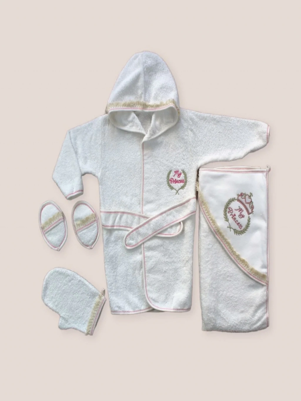 0-6 Ay Kaplan Nakışlı Bornozlu 5li Kız Bebek Havlu Silgi Takımı Pembe