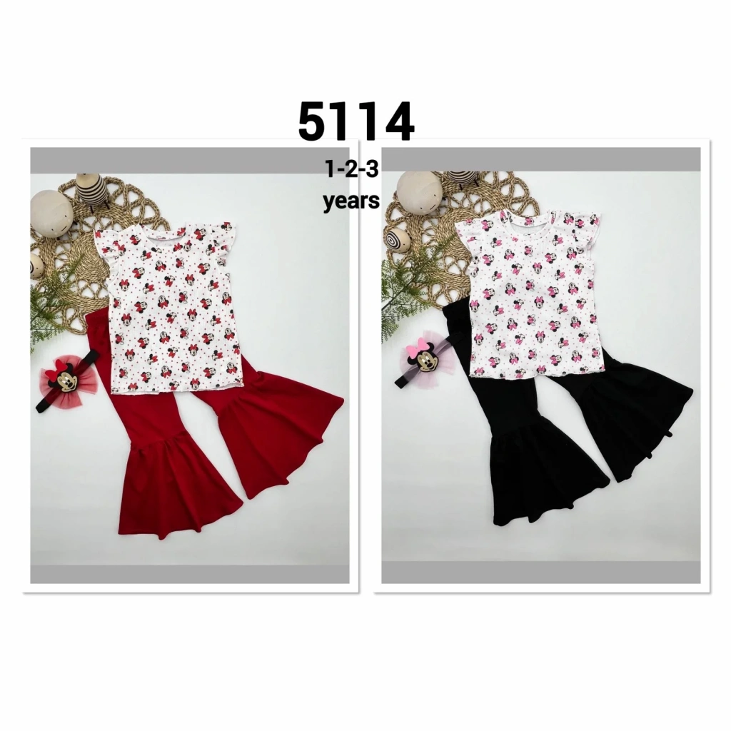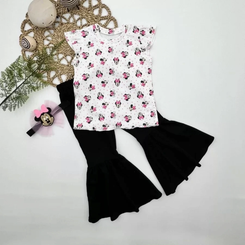 1-2-3-4 Yaş Mickey Baskılı Bandanalı Tişört İspanyol Paçalı Likralı 3lü Kız Çocuk Takımı Siyah