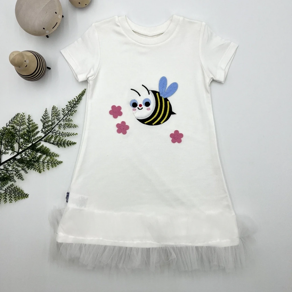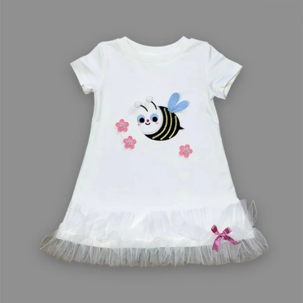 1-2-3 Yaş Arıcık Nakışlı Eteği Fırfırlı Jile Kız Çocuk Elbisesi Beyaz