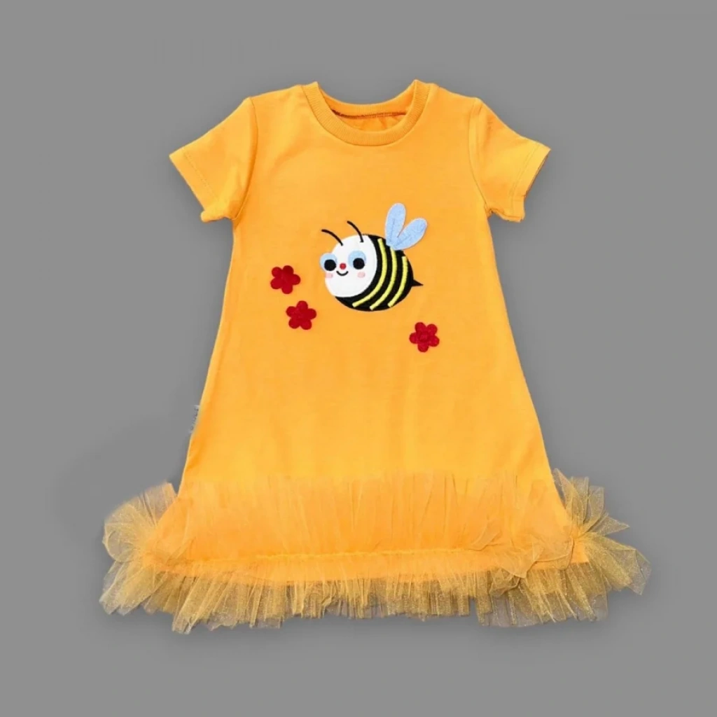 1-2-3 Yaş Arıcık Nakışlı Eteği Fırfırlı Jile Kız Çocuk Elbisesi Turuncu