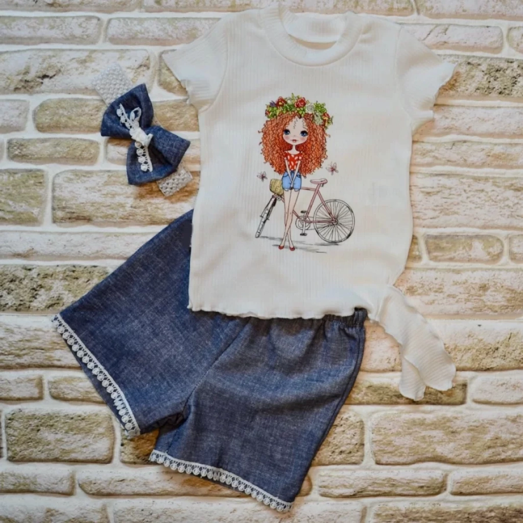1-2-3 Yaş Bisikletli Kız Baskılı Bandanalı Kot Desenli Şort Kısa Kollu Tişört 3lü Kız Bebek Takımı Lacivert