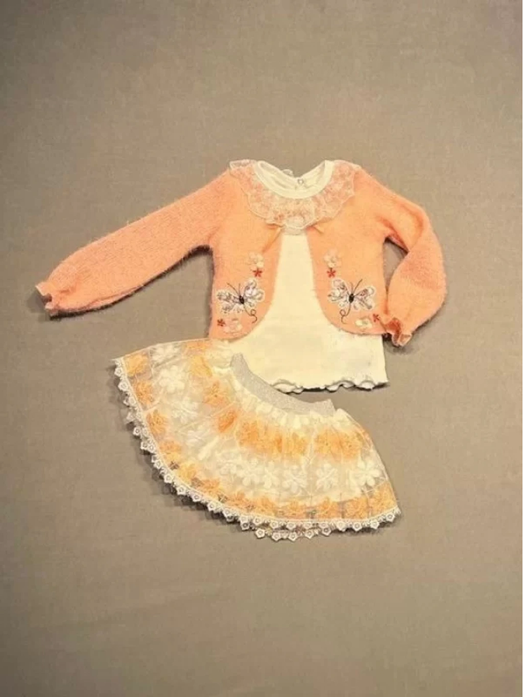 1-2-3 Yaş Brode Etekli Örme Hırkalı Uzun Kollu Sweat 3lü Kız Çocuk Takımı Somon