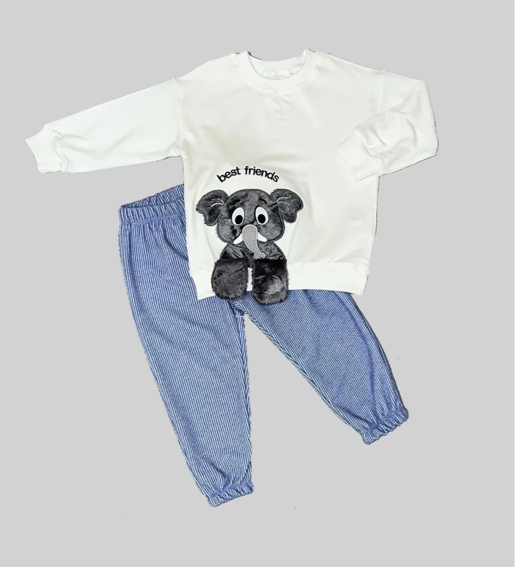 1-2-3 Yaş Filli Sallanan Ayak Desenli Likra Penye Kumaş Sweat Pantolonlu Kız Erkek 2li Çocuk Takımı Beyaz