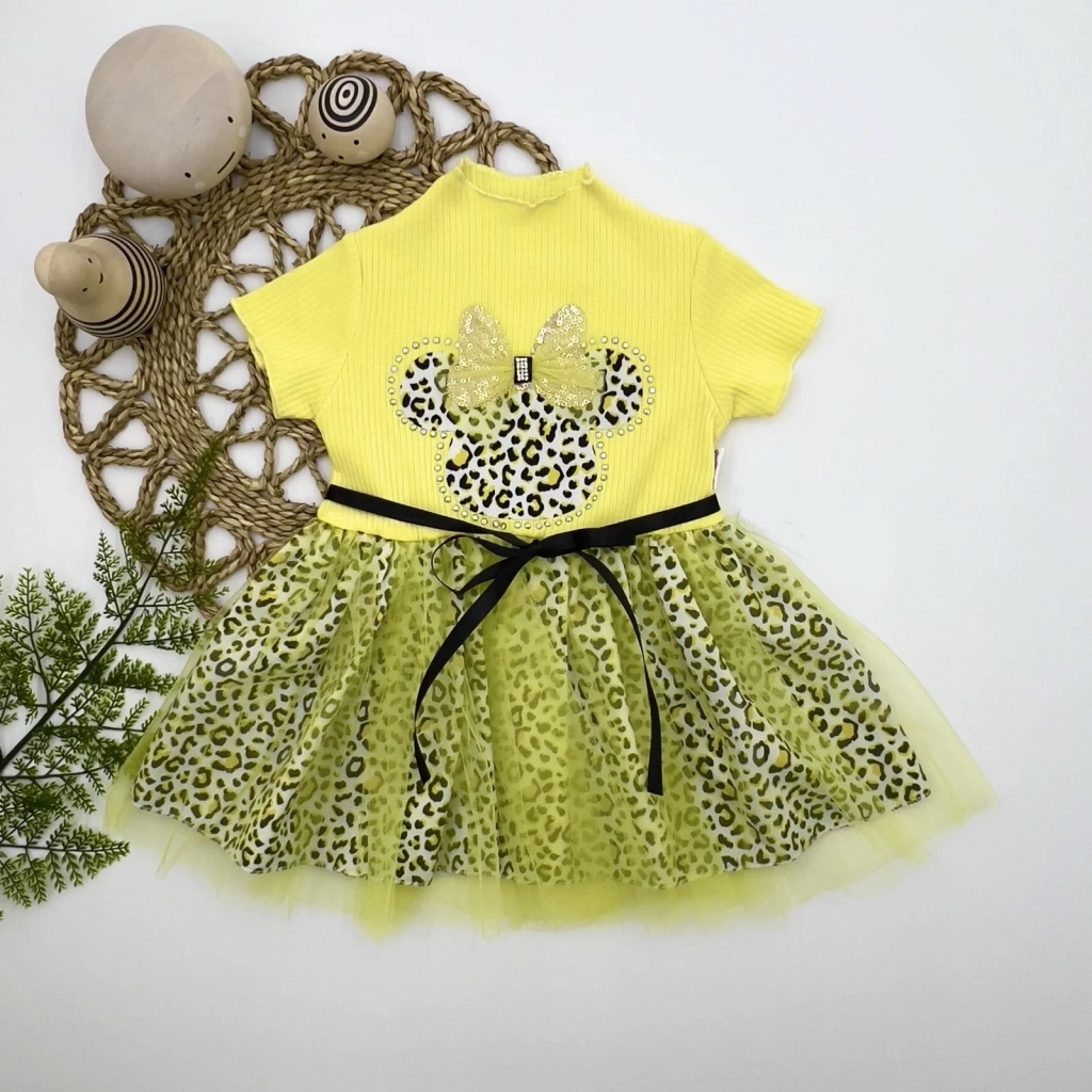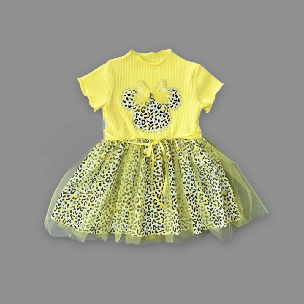 1-2-3 Yaş Fiyonklu Mickey Astarlı Etekli Kız Bebek Tütü Elbisesi Sarı