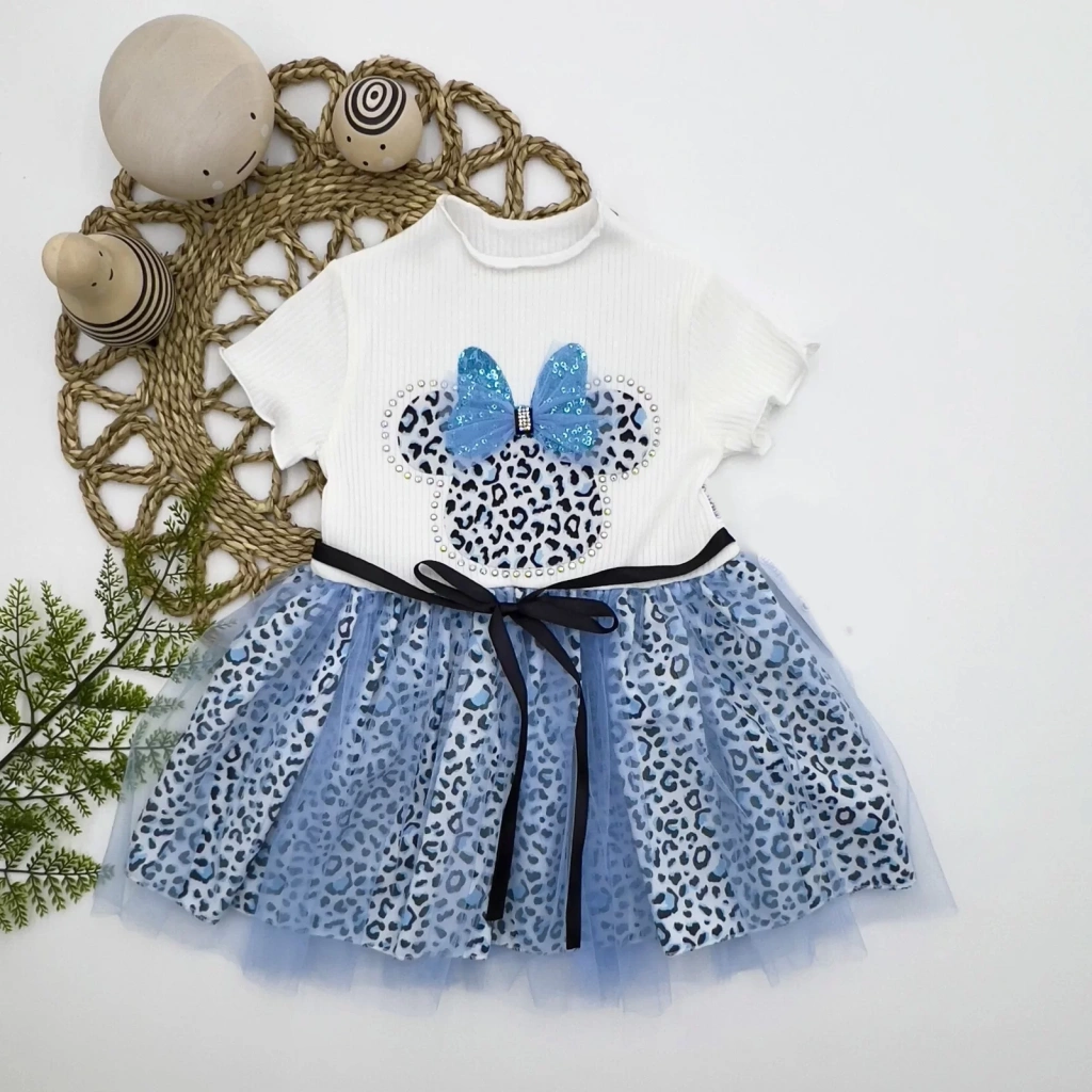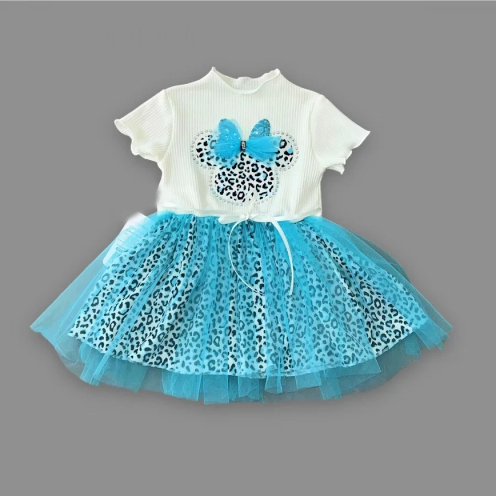 1-2-3 Yaş Fiyonklu Mickey Astarlı Etekli Kız Bebek Tütü Elbisesi Turkuaz-ekru