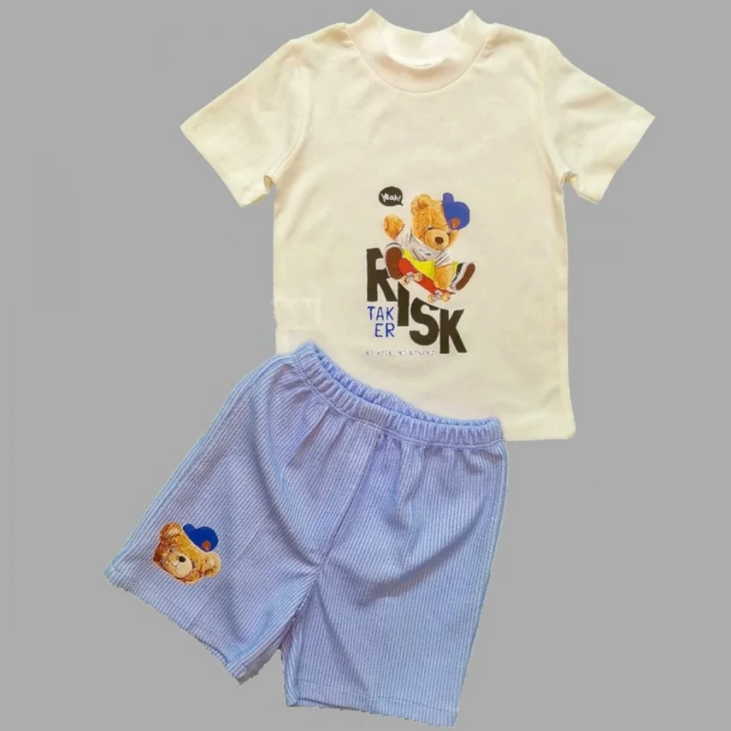 1-2-3 Yaş Kaykaycı Ayı Baskılı Şortlu Kısa Kollu Tişört 2li Erkek Bebek Takımı Ekru