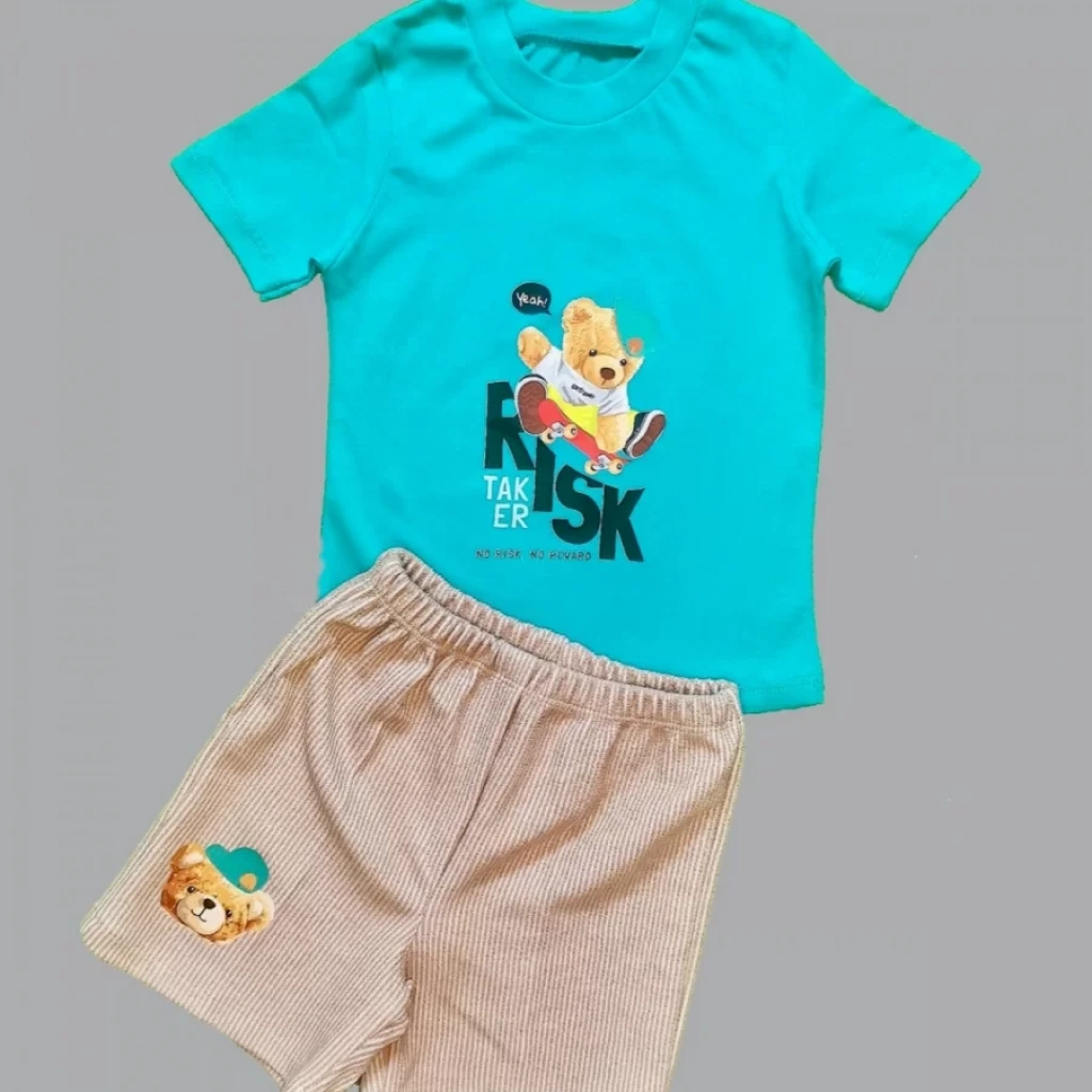 1-2-3 Yaş Kaykaycı Ayı Baskılı Şortlu Kısa Kollu Tişört 2li Erkek Bebek Takımı Turkuaz