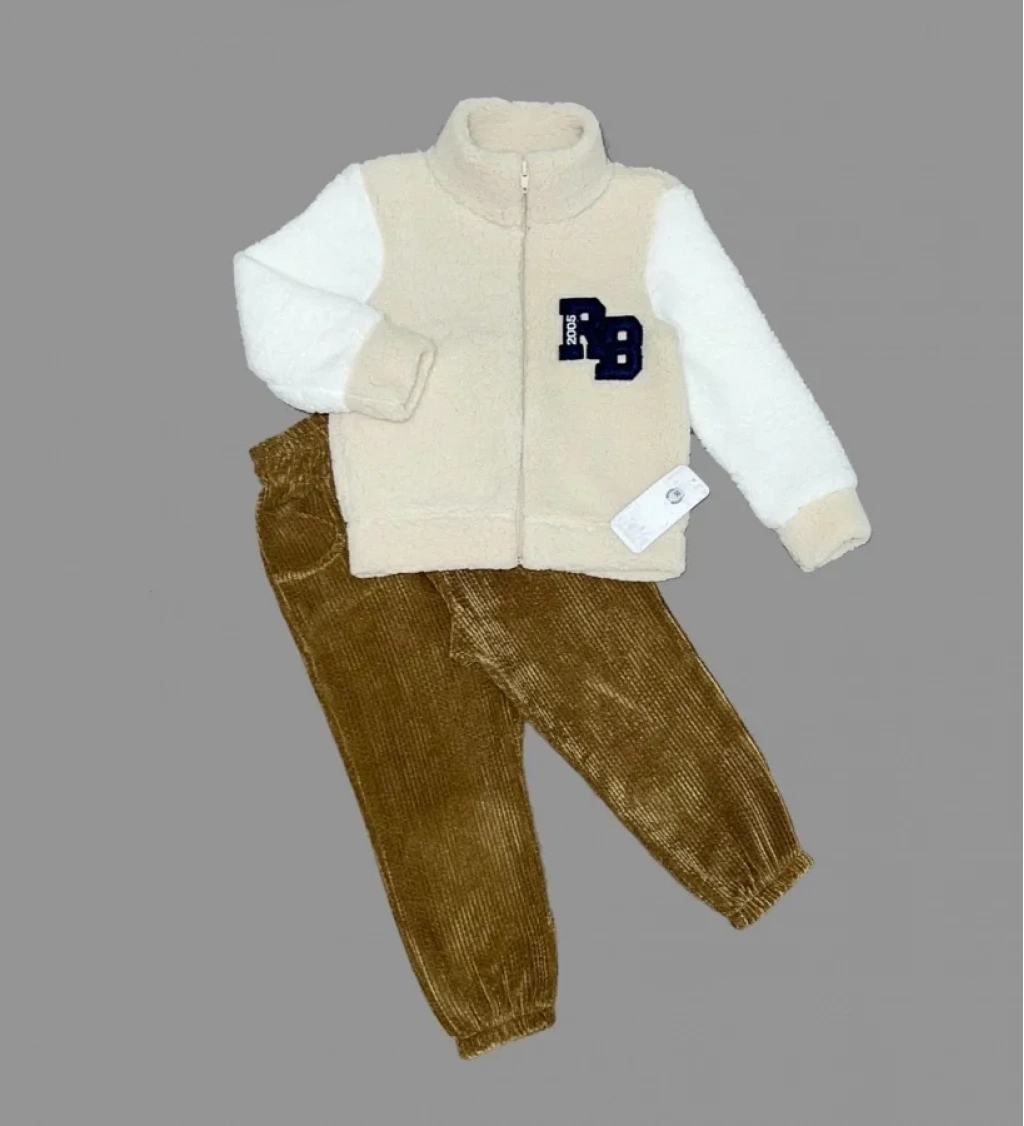 1-2-3 Yaş Kuzu Kumaş Fermuarlı Sweat Kadife Pantolonlu Uzun Kollu Kız Erkek Çocuk 2li Takım Bej