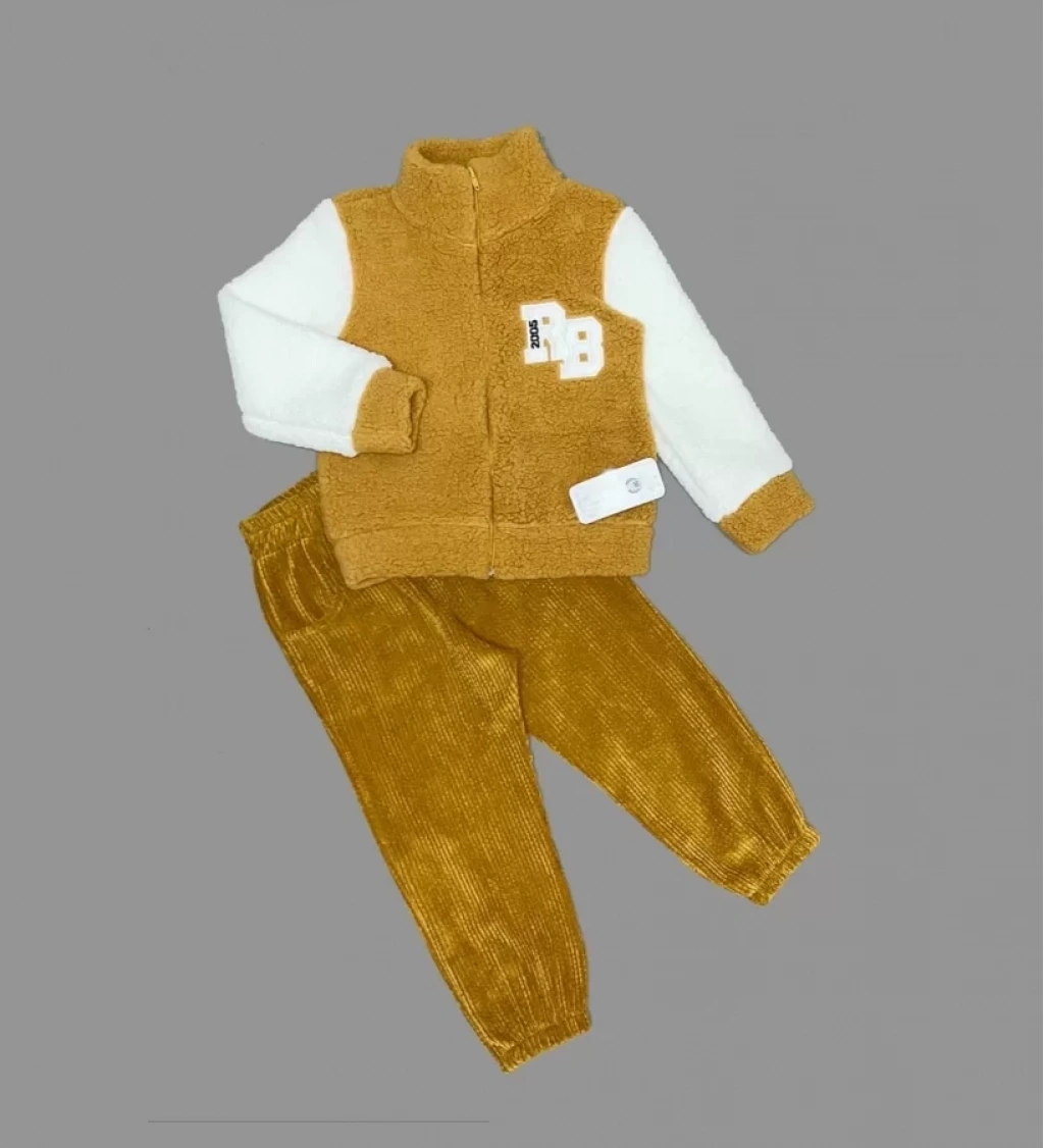 1-2-3 Yaş Kuzu Kumaş Fermuarlı Sweat Kadife Pantolonlu Uzun Kollu Kız Erkek Çocuk 2li Takım Hardal