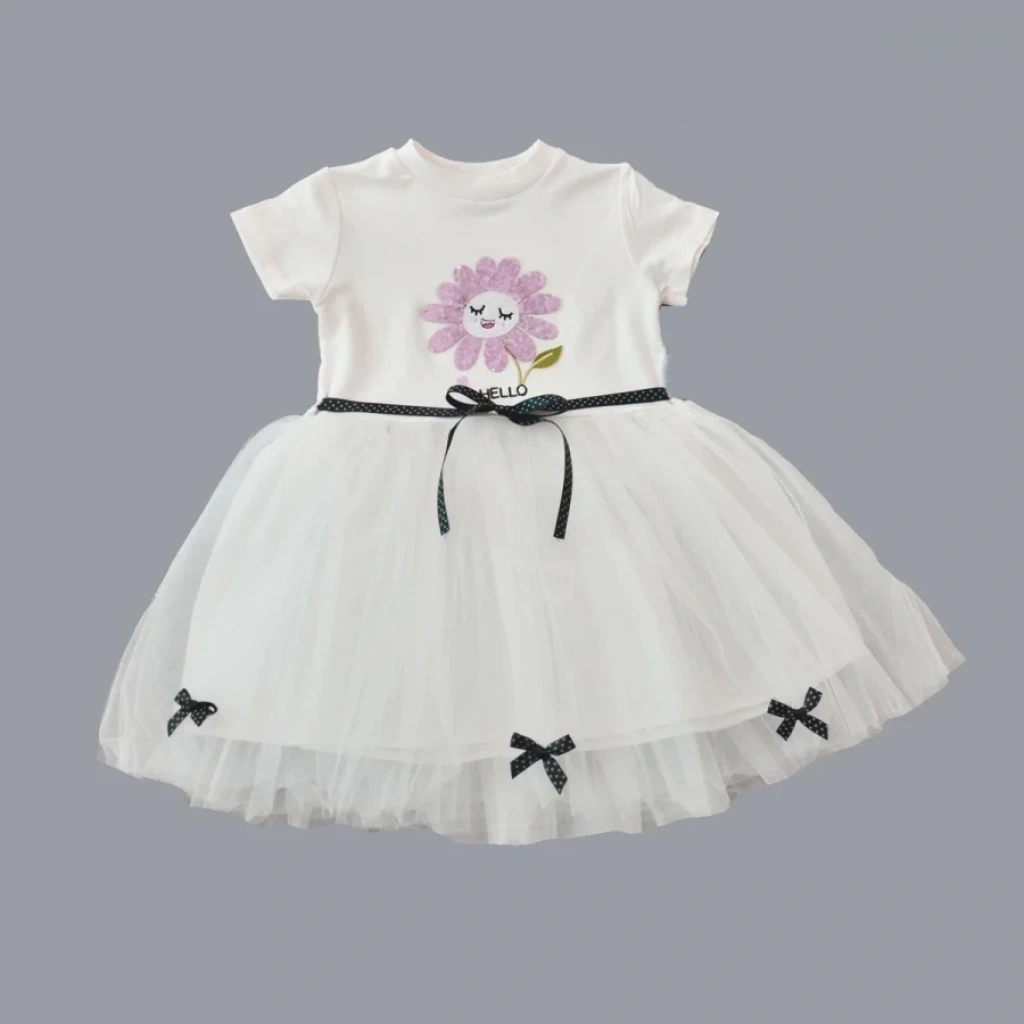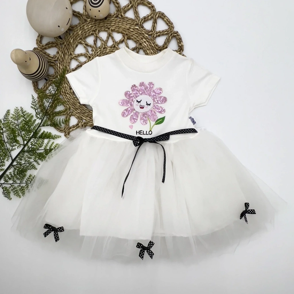 1-2-3 Yaş Payet Yapraklı Çiçek Nakışlı Astarlı Kız Bebek Tütü Elbisesi Beyaz