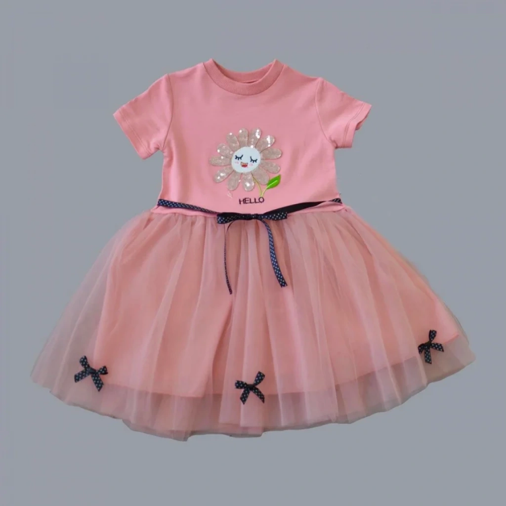 1-2-3 Yaş Payet Yapraklı Çiçek Nakışlı Astarlı Kız Bebek Tütü Elbisesi Gül Kurusu