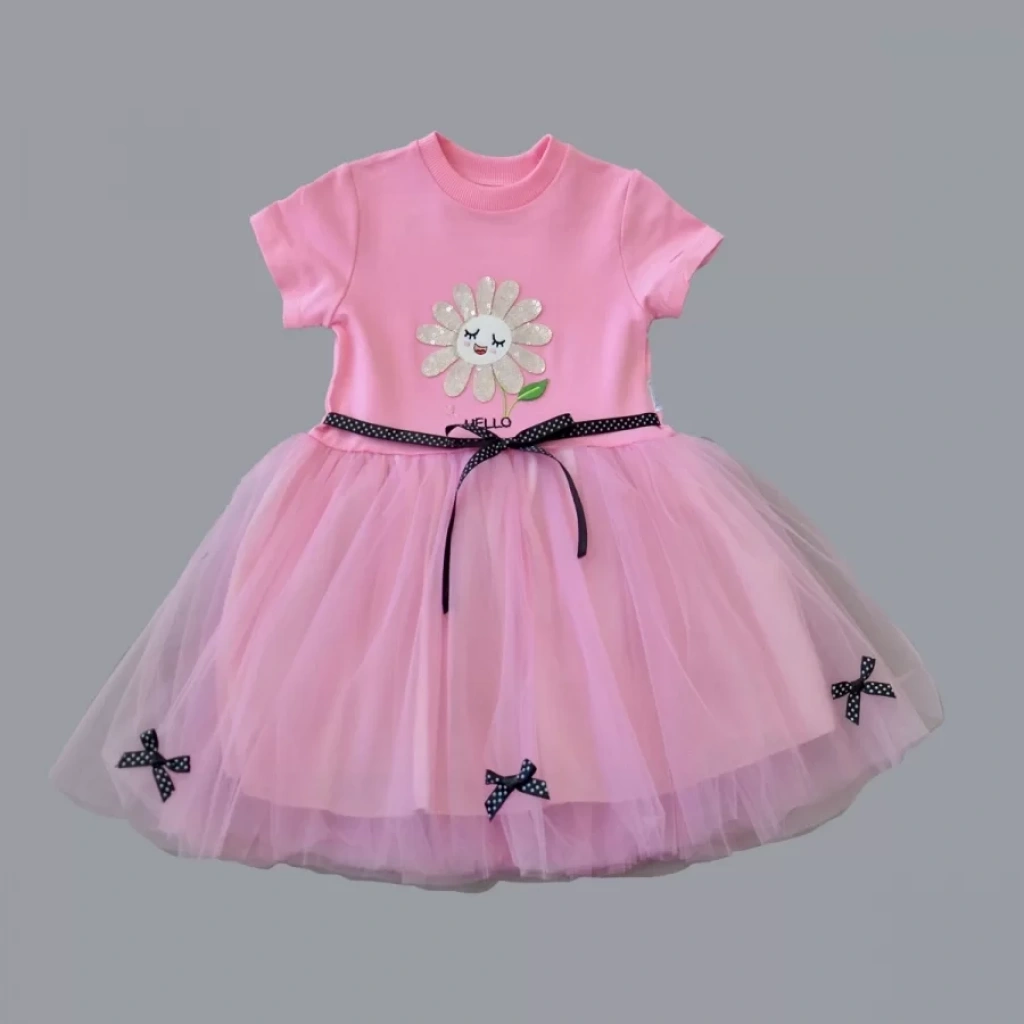 1-2-3 Yaş Payet Yapraklı Çiçek Nakışlı Astarlı Kız Bebek Tütü Elbisesi Pembe