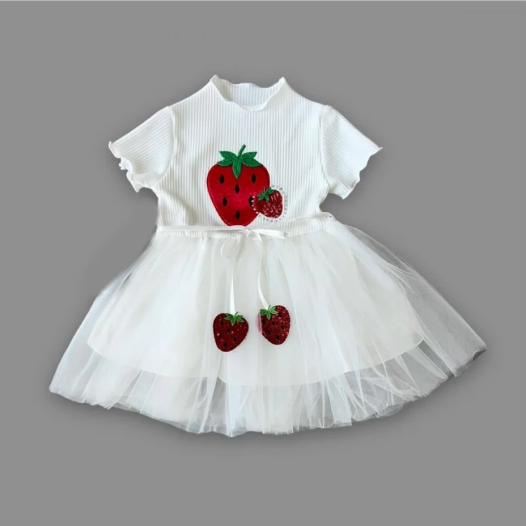 1-2-3 Yaş Payetli Çilek Baskılı Çilek Kuşaklı Kız Bebek Elbisesi Beyaz