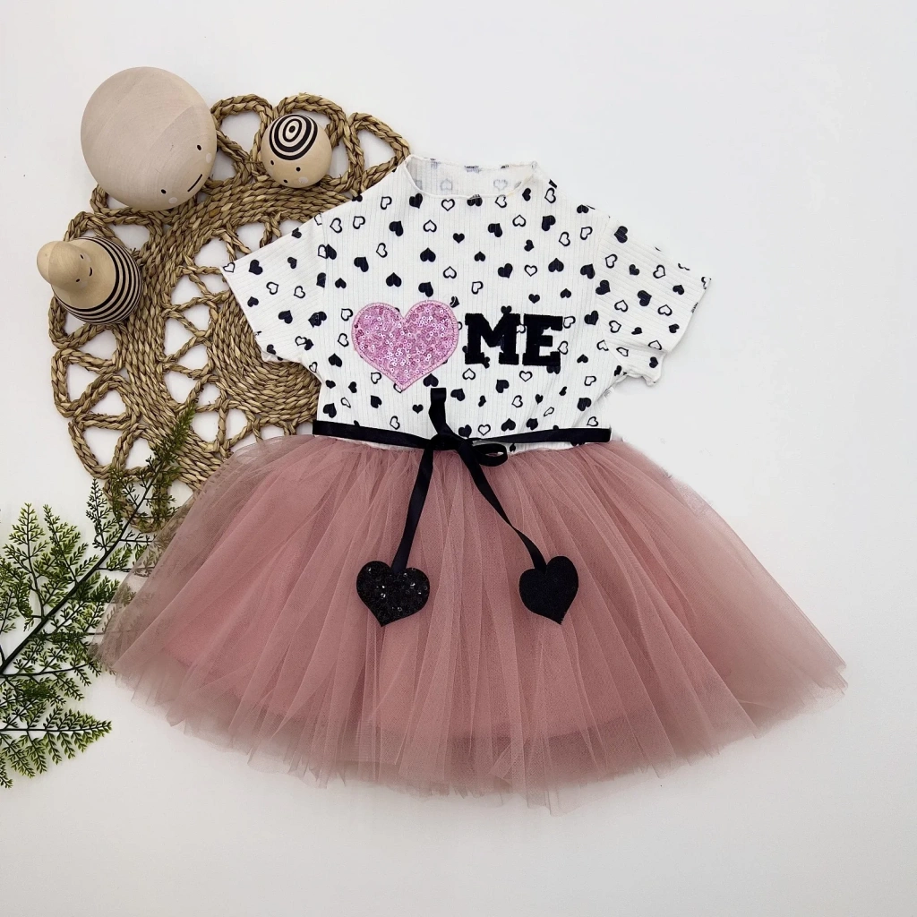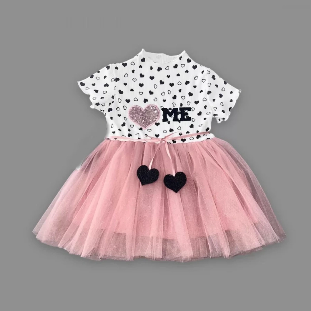 1-2-3 Yaş Payetli Kalp Me Baskılı Kız Bebek Elbisesi Gül Kurusu