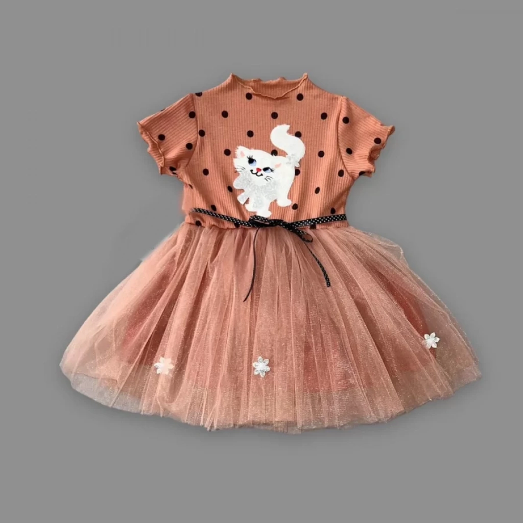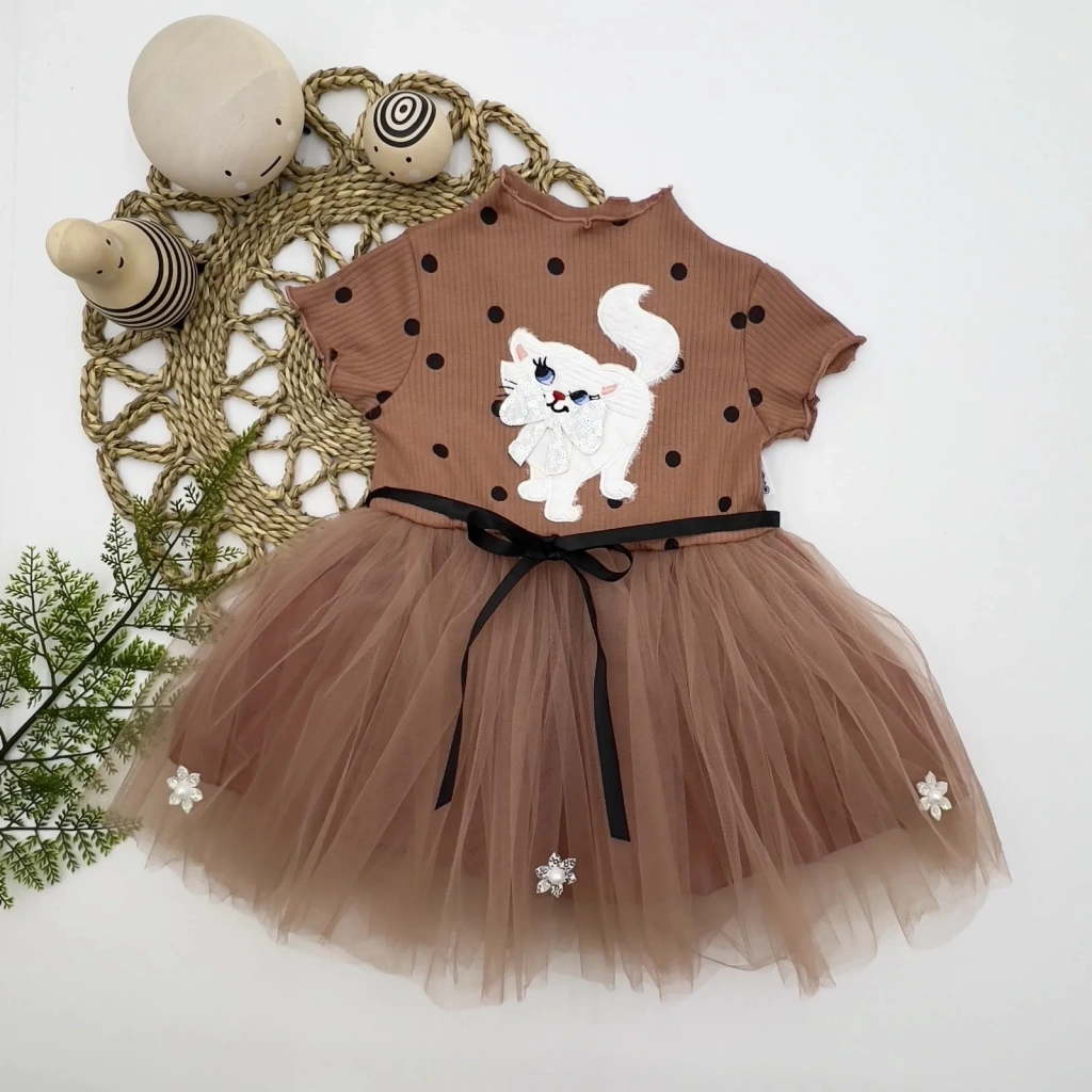 1-2-3 Yaş Payetli Kedicik Baskılı Puantiyeli Kız Bebek Elbisesi Kahverengi