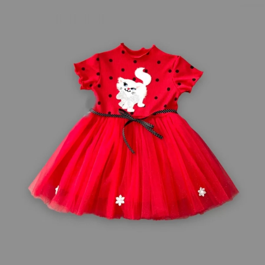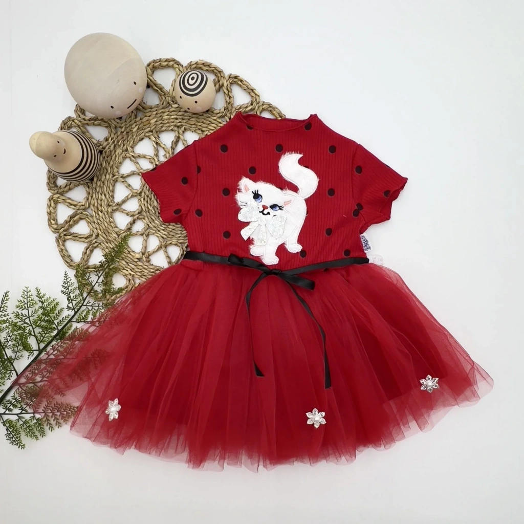 1-2-3 Yaş Payetli Kedicik Baskılı Puantiyeli Kız Bebek Elbisesi Kırmızı