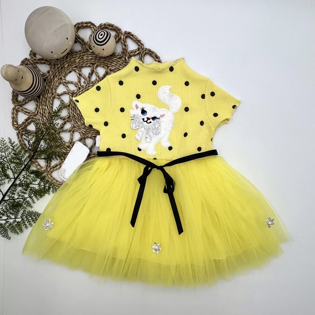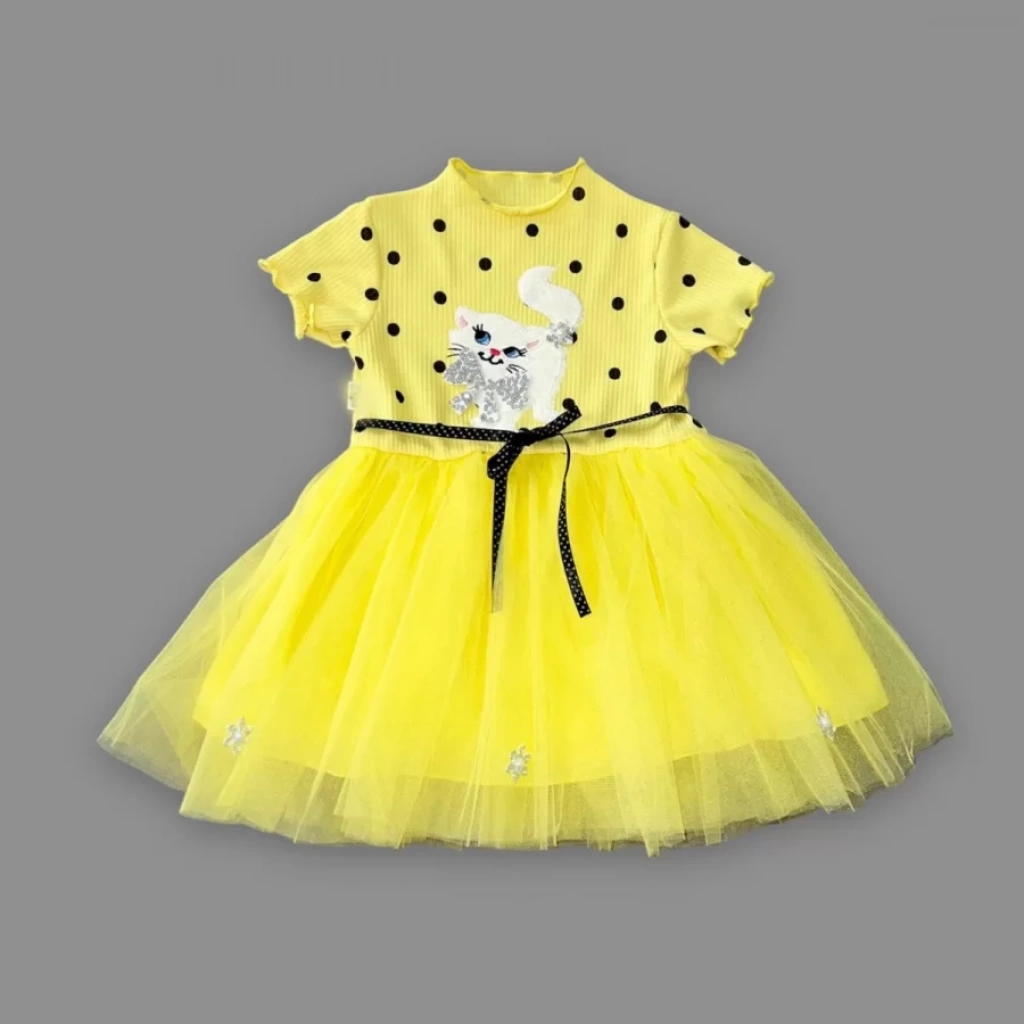 1-2-3 Yaş Payetli Kedicik Baskılı Puantiyeli Kız Bebek Elbisesi Sarı
