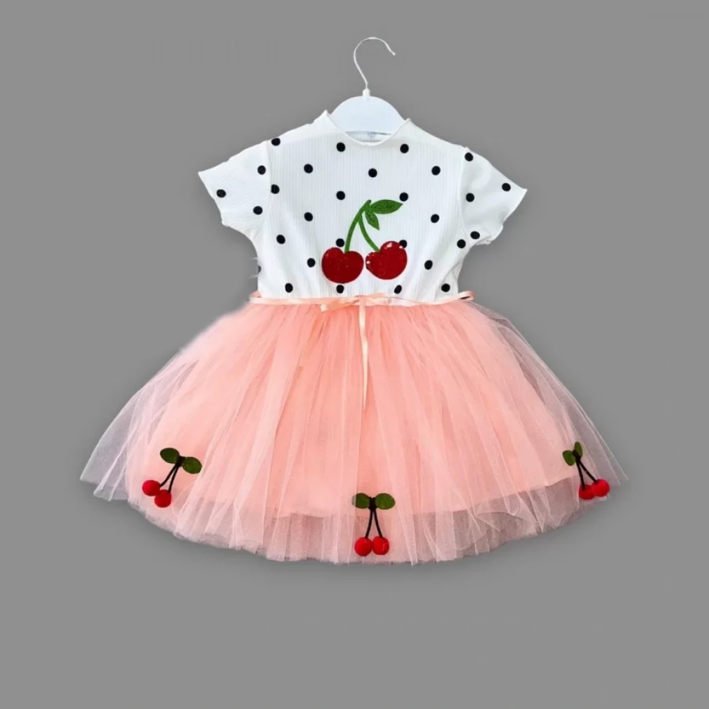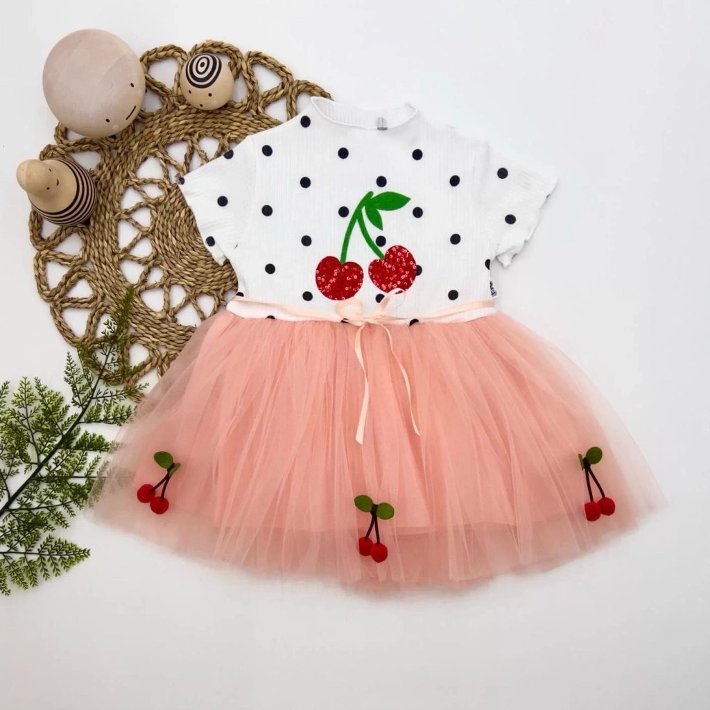 1-2-3 Yaş Payetli Kiraz Nakışlı Kiraz Etekli Kız Bebek Tütü Elbisesi Pudra