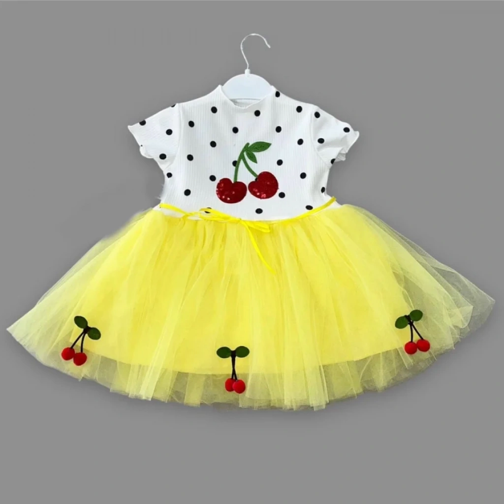 1-2-3 Yaş Payetli Kiraz Nakışlı Kiraz Etekli Kız Bebek Tütü Elbisesi Sarı