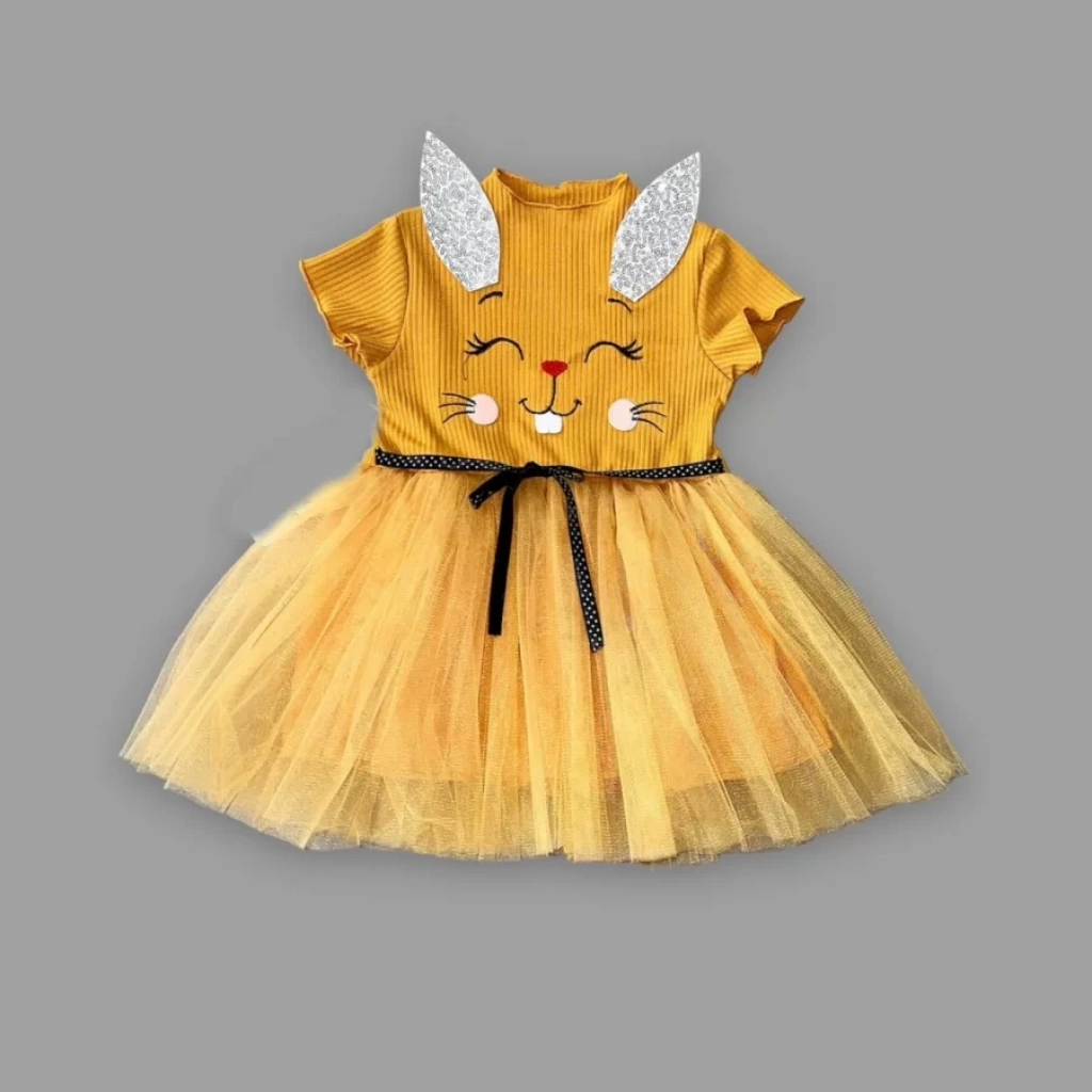1-2-3 Yaş Payetli Kulak Tavşan Baskılı Kız Bebek Elbisesi Hardal
