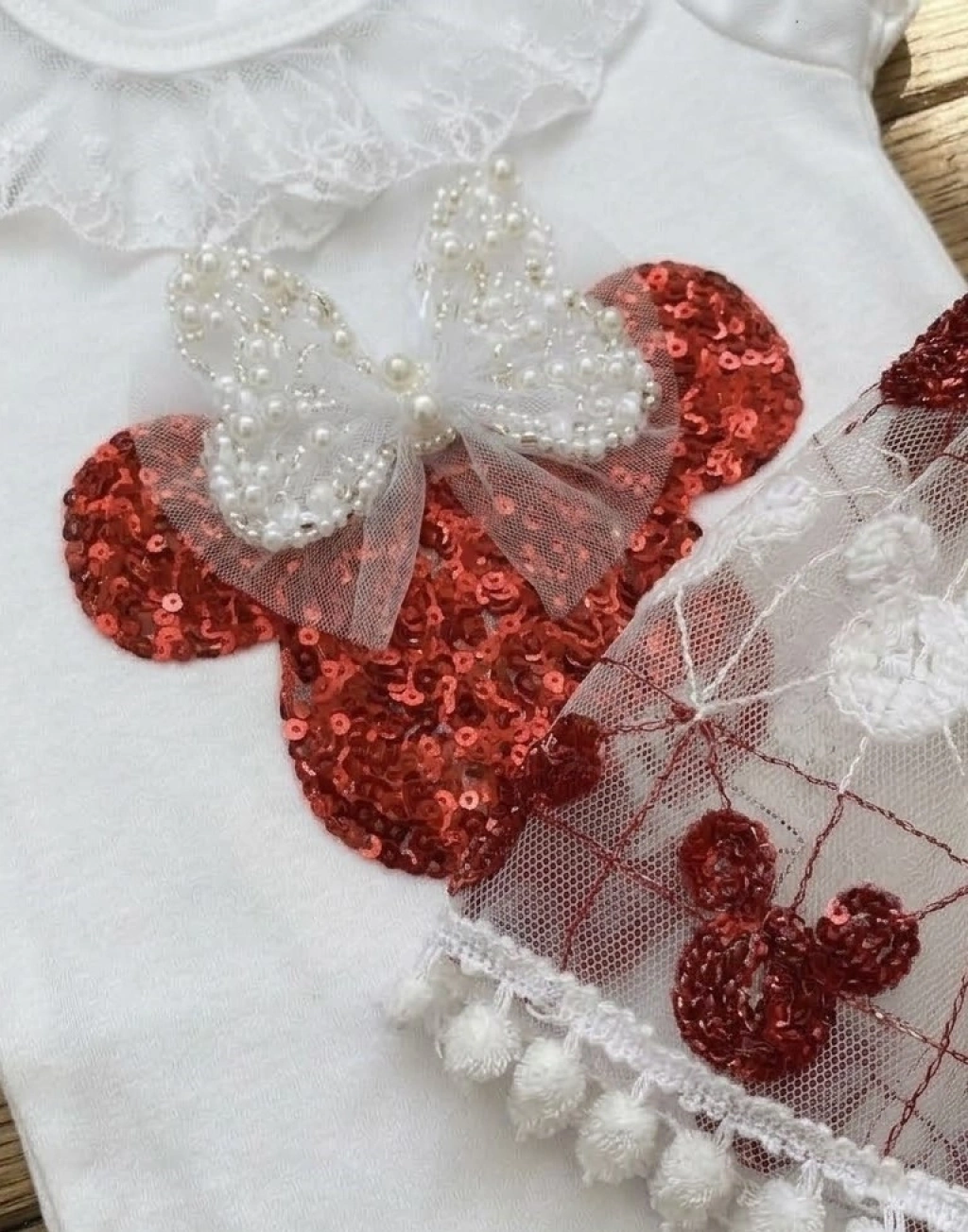 Minik prenseslerin enerjisine ve şıklığına hitap eden bu özel takım, konfor ve zarafeti bir arada sunuyor. Canlı kırmızı rengiyle dikkat çeken set; üst kısımda yer alan ışıl ışıl payetli Mickey nakışı ile çocukların favorisi olmaya aday. Alt kısımdaki brode detaylı etek ise takıma klasik ve seçkin bir hava katıyor. Kısa kollu yapısı sayesinde yaz aylarında ve özel günlerde bebeğinizin cildinin nefes almasını sağlar, hareket özgürlüğünü kısıtlamaz. Hem günlük şıklık hem de doğum günü gibi özel kutlamalar için mükemmel bir tercihtir