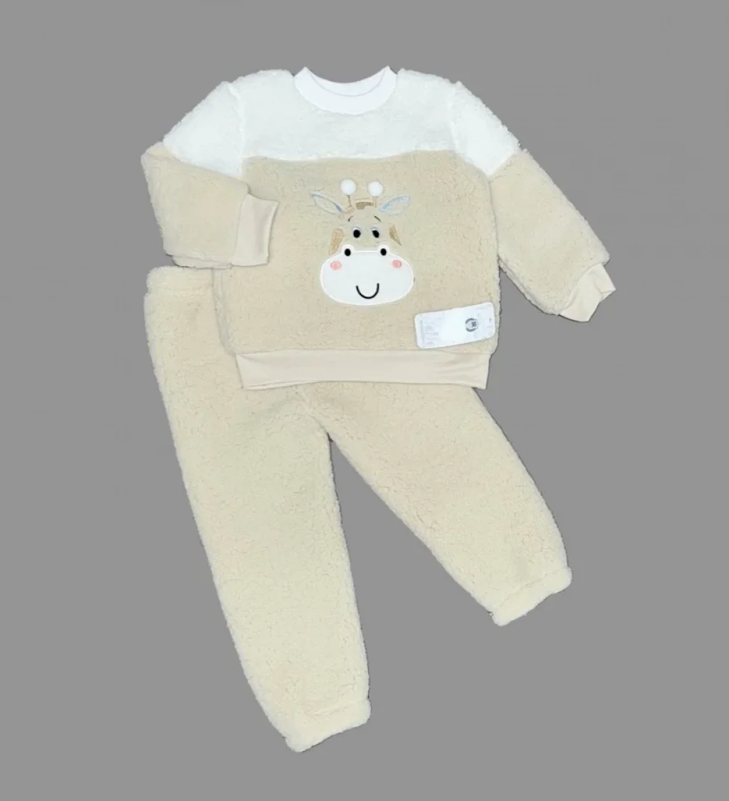 1-2-3 Yaş Ponponlu Zürafa Desenli Kuzu Kumaş Uzun Kollu 2li Kız Erkek Çocuk Takımı Bej