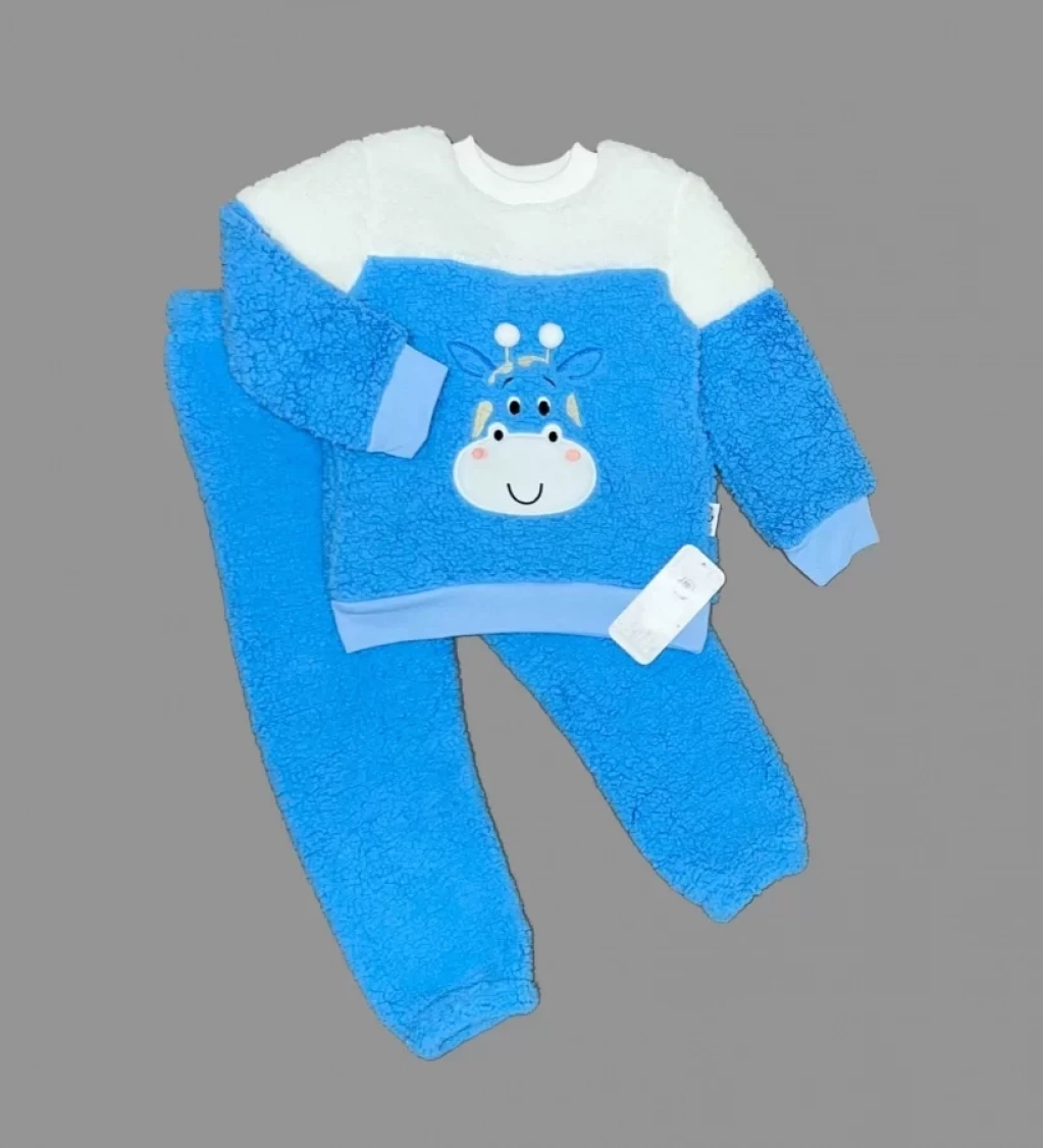 1-2-3 Yaş Ponponlu Zürafa Desenli Kuzu Kumaş Uzun Kollu 2li Kız Erkek Çocuk Takımı Saks Mavisi