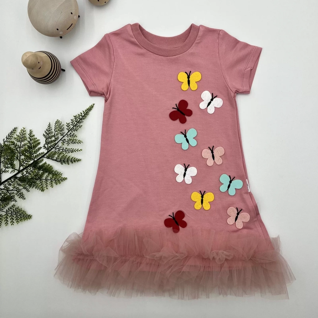1-2-3 Yaş Renkli Kelebekler Nakışlı Eteği Fırfırlı Jile Çocuk Elbisesi Gül Kurusu