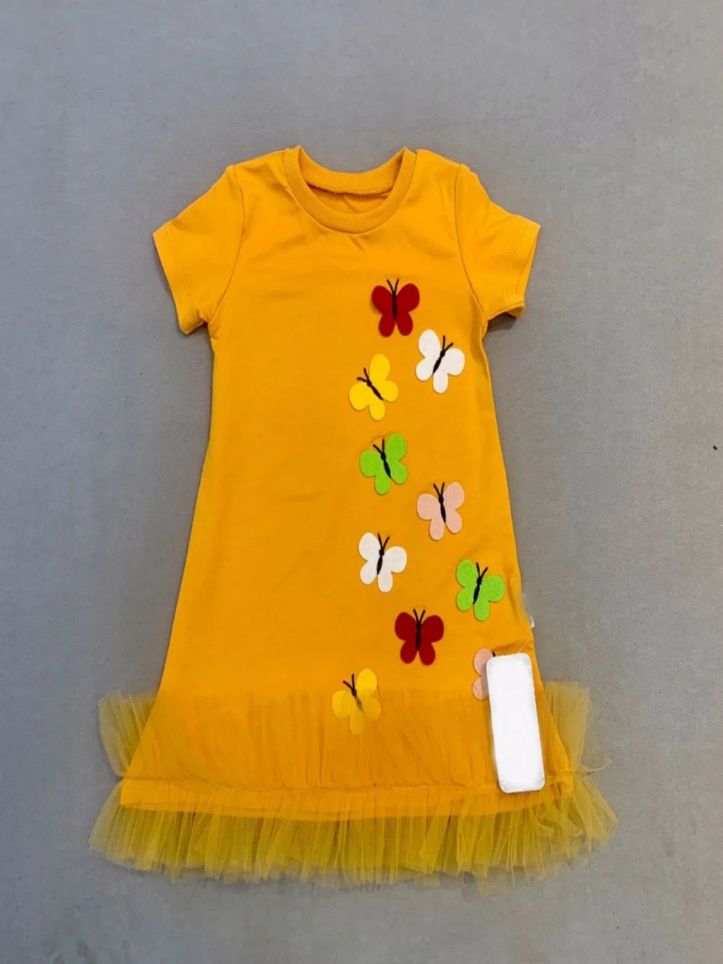 1-2-3 Yaş Renkli Kelebekler Nakışlı Eteği Fırfırlı Jile Çocuk Elbisesi Turuncu