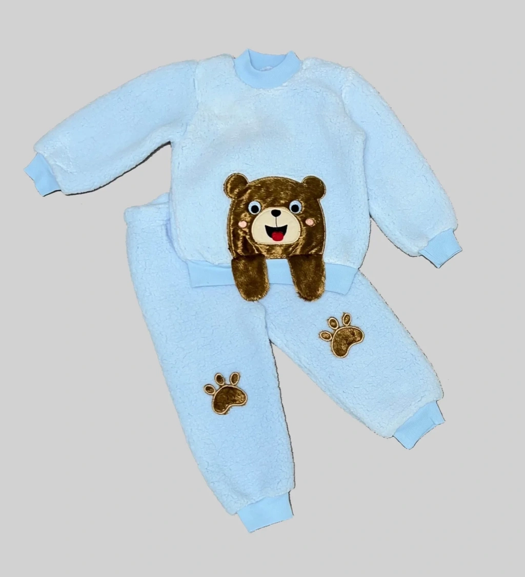 1-2-3 Yaş Sallanan El Ayıcıklı Kuzu Kumaş Sweat Patili Pantolon Uzun Kollu Kız Erkek 2 Li Takımı Mavi