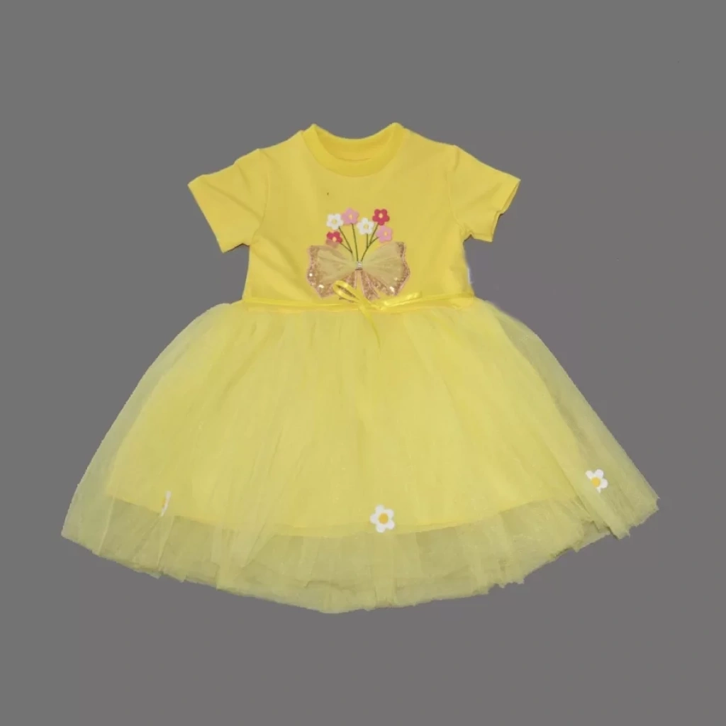 1-2-3 Yaş Tül Fiyonk Çiçekler Nakışlı Astarlı Kız Bebek Tütü Elbisesi Sarı