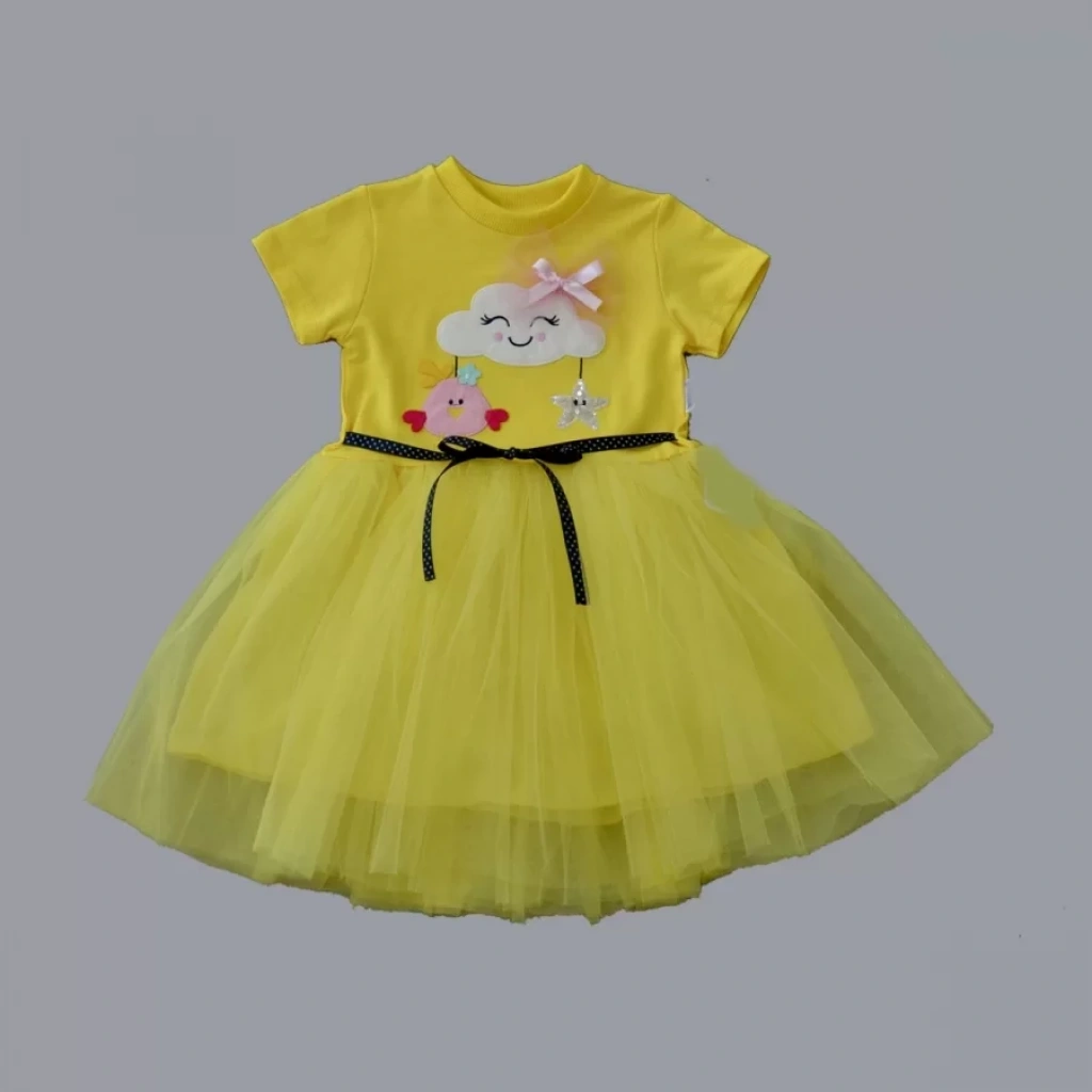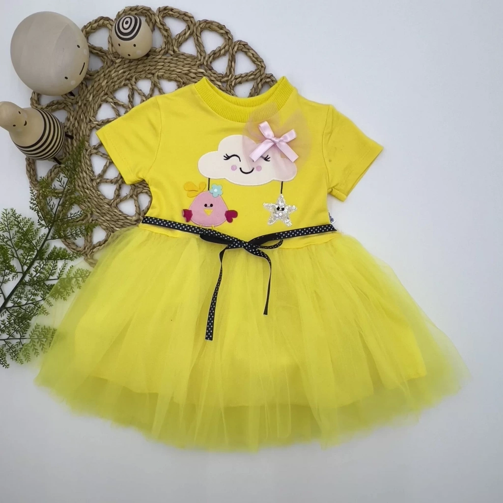 1-2-3 Yaş Tül Tokalı Bulut Civciv Ve Yıldız Nakışlı Kız Bebek Elbisesi Sarı