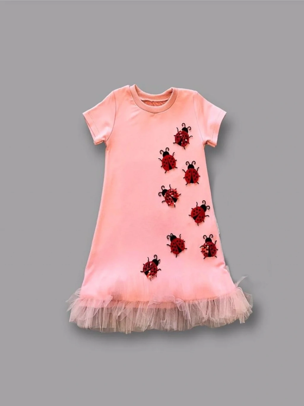 1-2-3 Yaş Uğur Böceği Nakışlı Fırfır Uçlu Kız Çocuk Jile Elbisesi Pudra