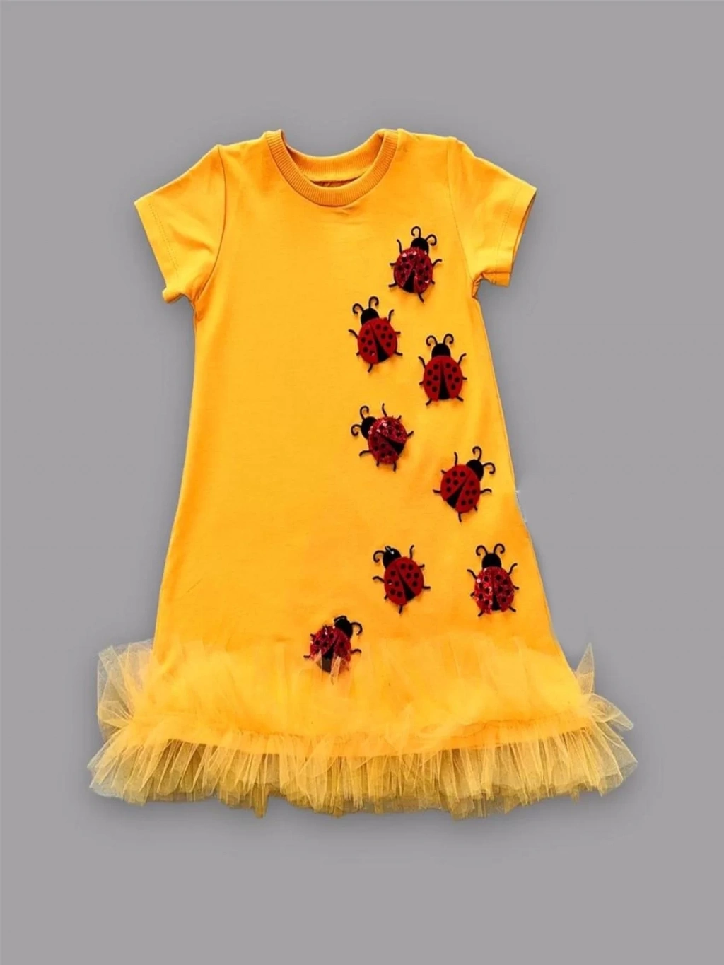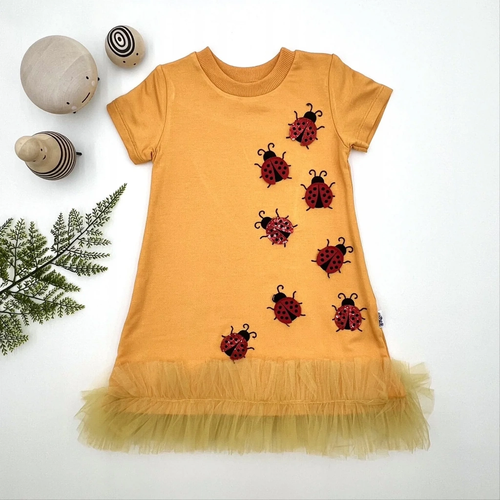 1-2-3 Yaş Uğur Böceği Nakışlı Fırfır Uçlu Kız Çocuk Jile Elbisesi Turuncu