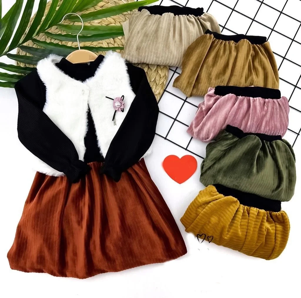 2-3-4-5 Yaş Kadife Etekli Tüylü Yelek Uzun Kollu Siyah Sweat 3lü Kız Bebek Takımı Kahverengi