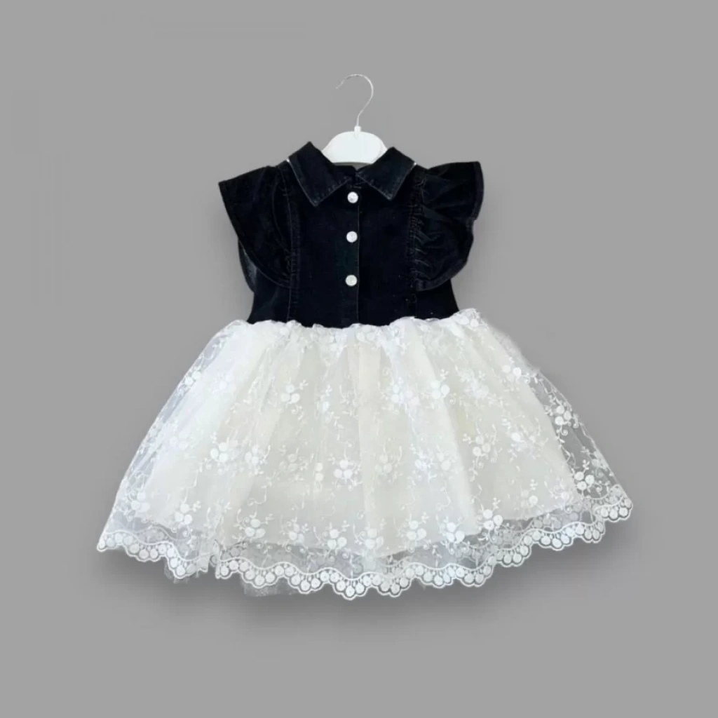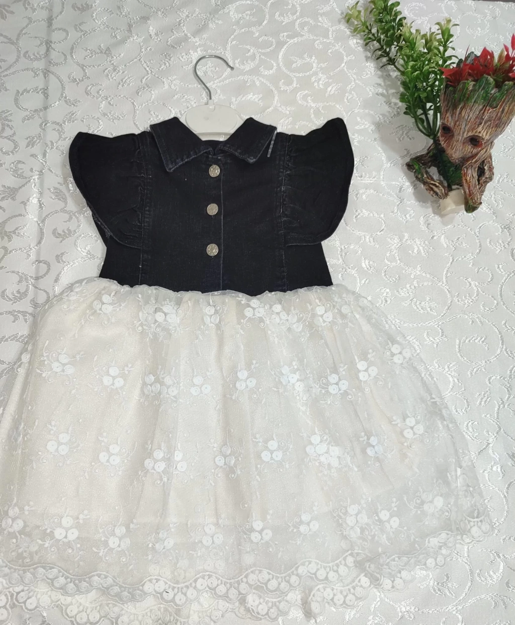 2-3-4 Yaş Astarlı Brode Etekli Kot Kumaş Düğmeli Kız Çocuk Elbisesi Siyah