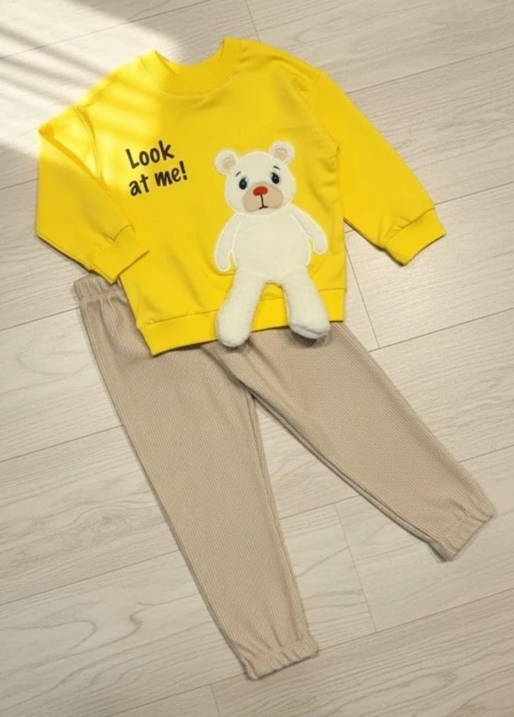 Çocuğunuzun gün boyu özgürce hareket etmesini, oyun oynarken hem rahat etmesini hem de çok şirin görünmesini ister misiniz? Canlı sarı rengi ve sempatik ayıcık figürüyle bu takım, gardırobun yeni favorisi olmaya aday!