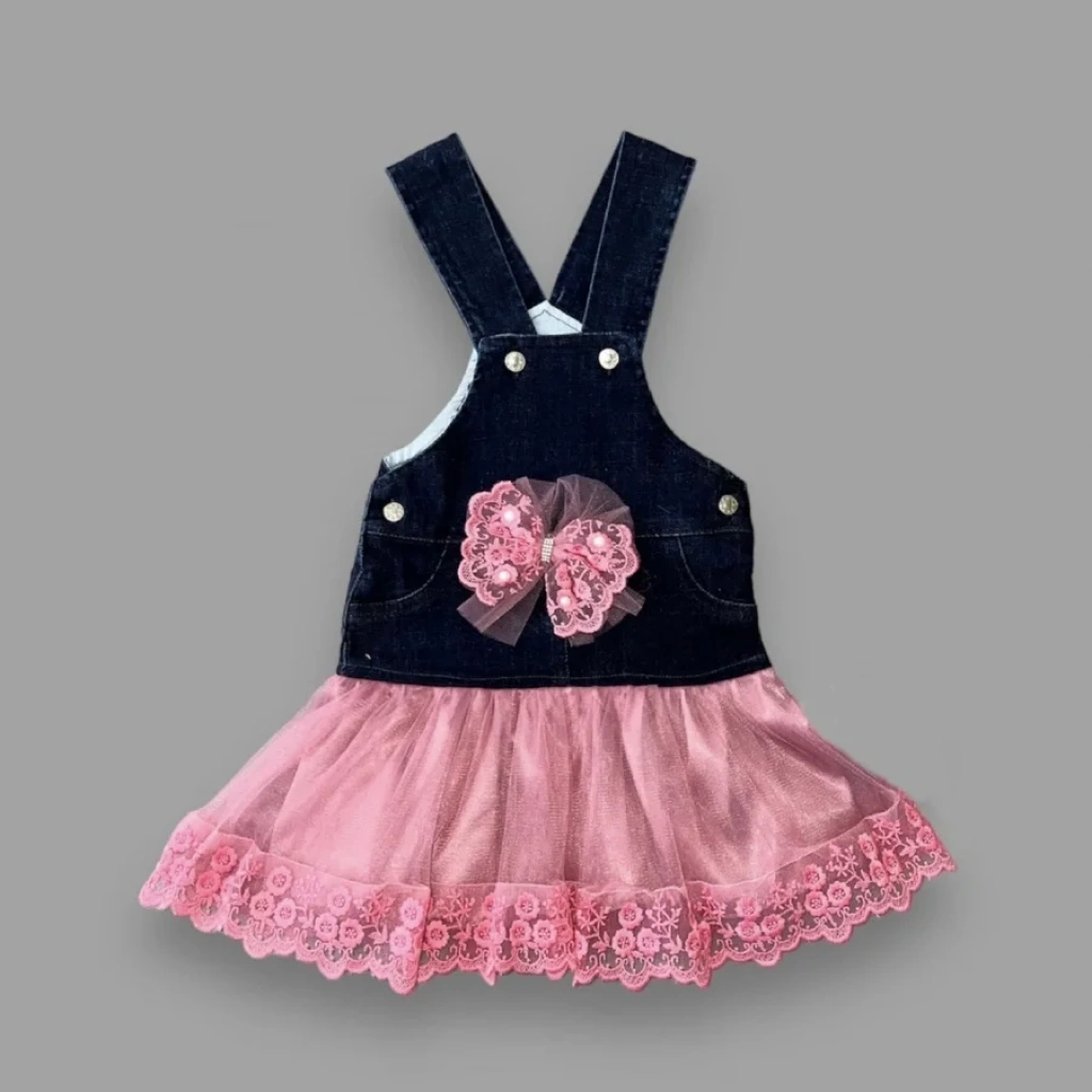 2-3-4 Yaş Fiyonklu Düğme Detaylı Tül Etek Kot Kumaş Salopet Kız Çocuk Elbisesi Lacivert-gül Kurusu