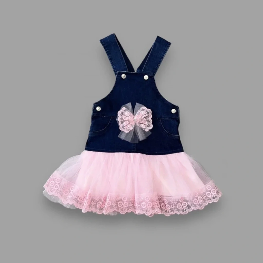 2-3-4 Yaş Fiyonklu Düğme Detaylı Tül Etek Kot Kumaş Salopet Kız Çocuk Elbisesi Lacivert-pembe