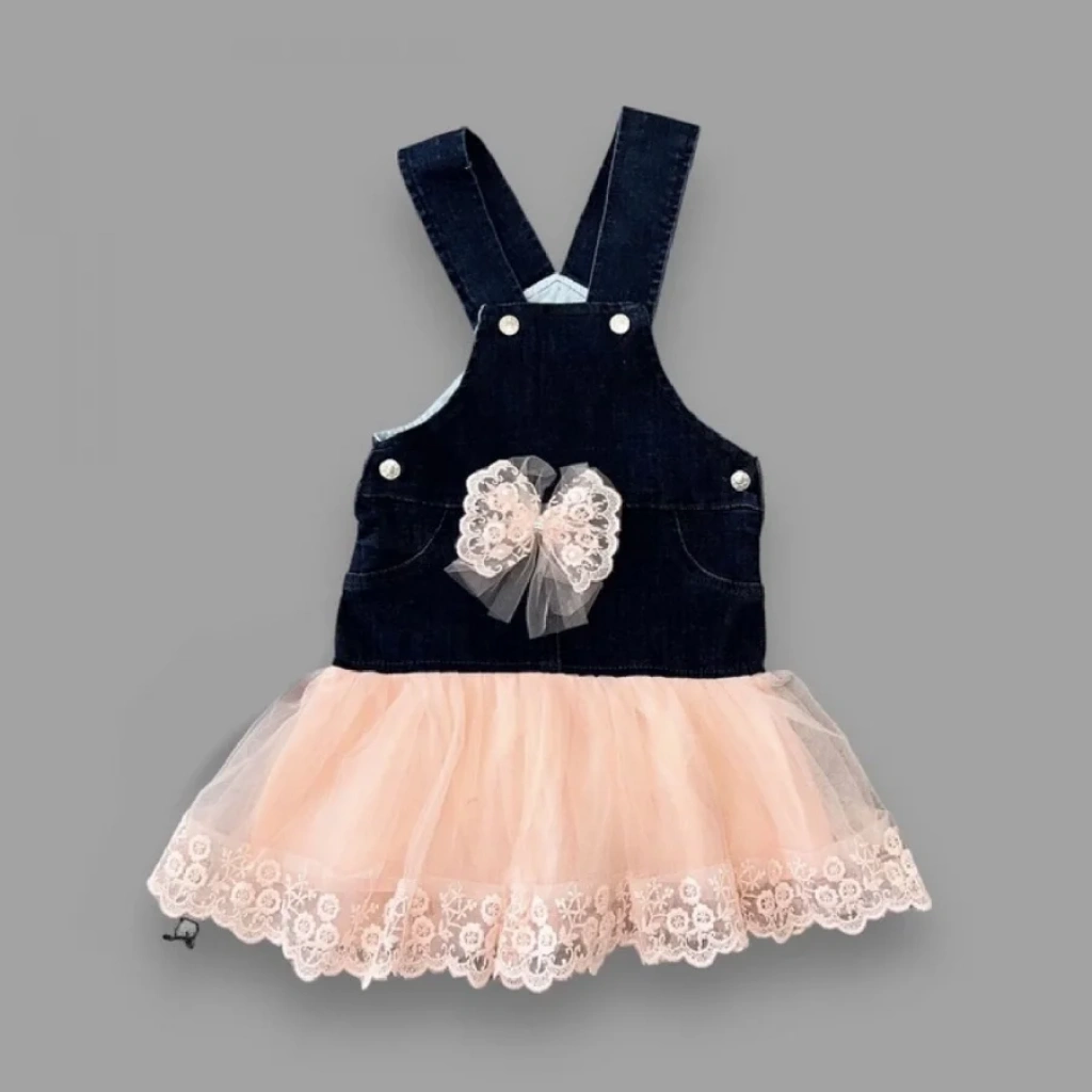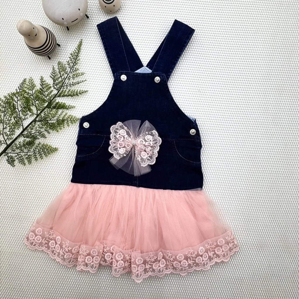 2-3-4 Yaş Fiyonklu Düğme Detaylı Tül Etek Kot Kumaş Salopet Kız Çocuk Elbisesi Lacivert-pudra