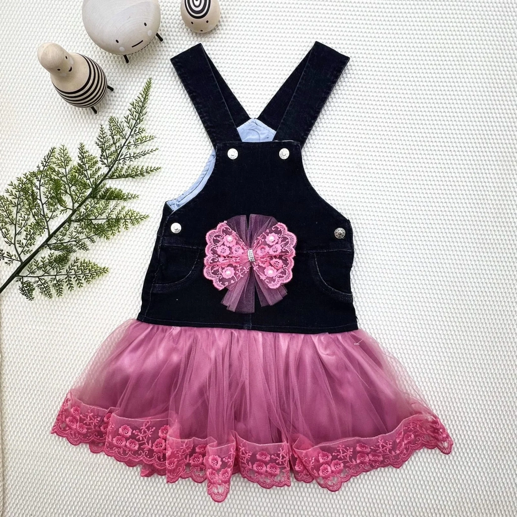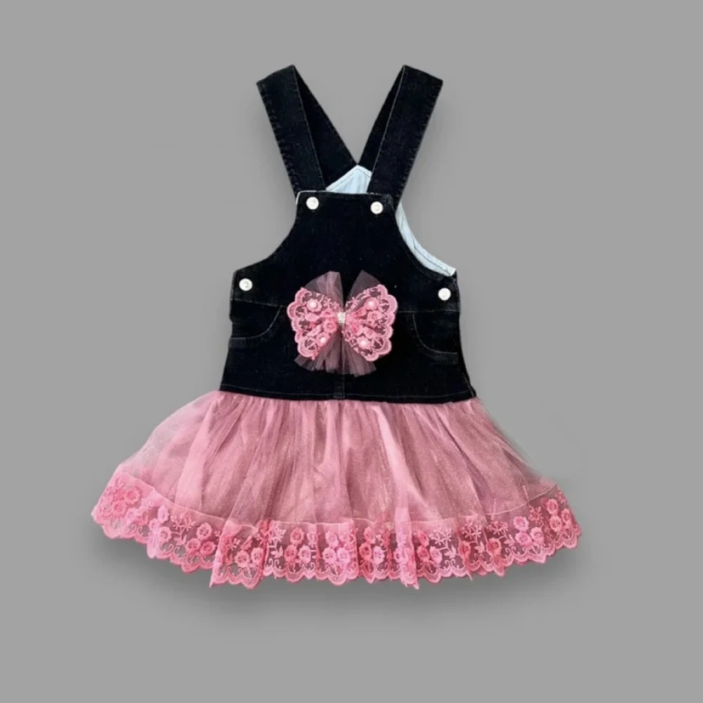 2-3-4 Yaş Fiyonklu Düğme Detaylı Tül Etek Kot Kumaş Salopet Kız Çocuk Elbisesi Siyah-gül Kurusu