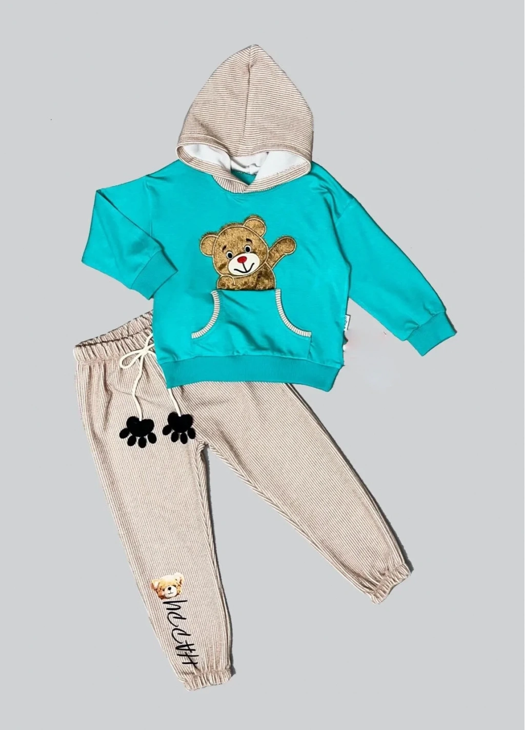 2-3-4 Yaş Pelüş Ayı Desenli Kapşonlu Uzun Kollu Penye Sweat 2li Erkek Çocuk Takımı Mint Yeşili