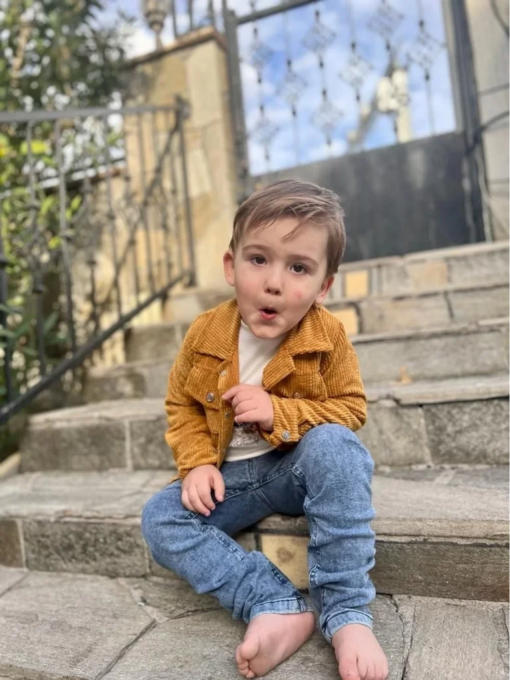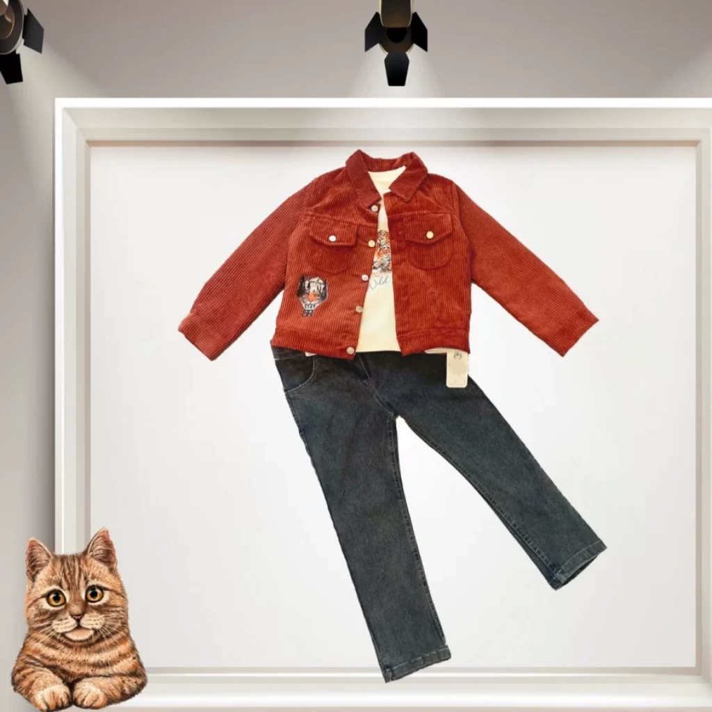 3-4-5 Yaş Fitilli Kadife Ceket Kot Pantolonlu 3lü Kız Erkek Çocuk Takımı Kiremit
