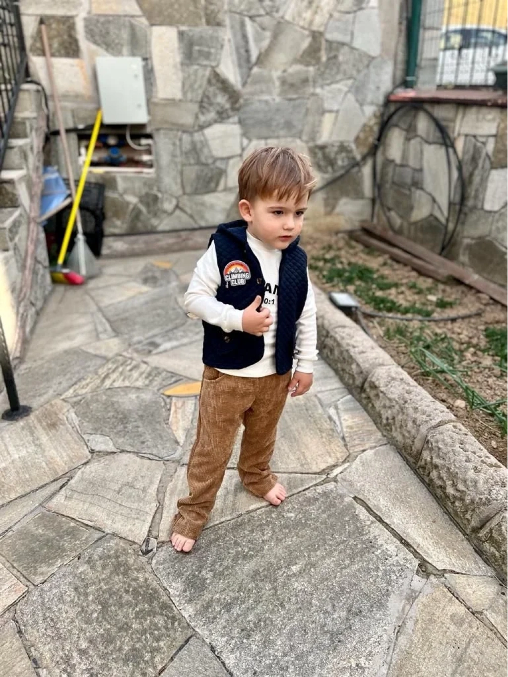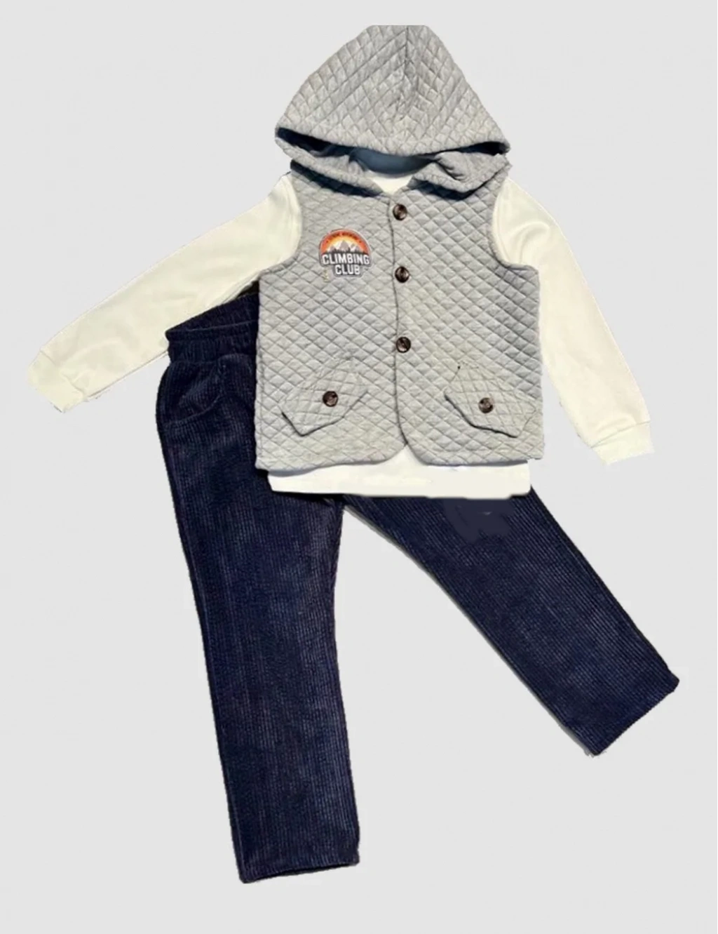 3-4-5 Yaş Fitilli Kadife Pantolon Kapitone Kapşonlu Yelek Uzun Kollu Sweat 3lü Erkek Çocuk Takımı Gri
